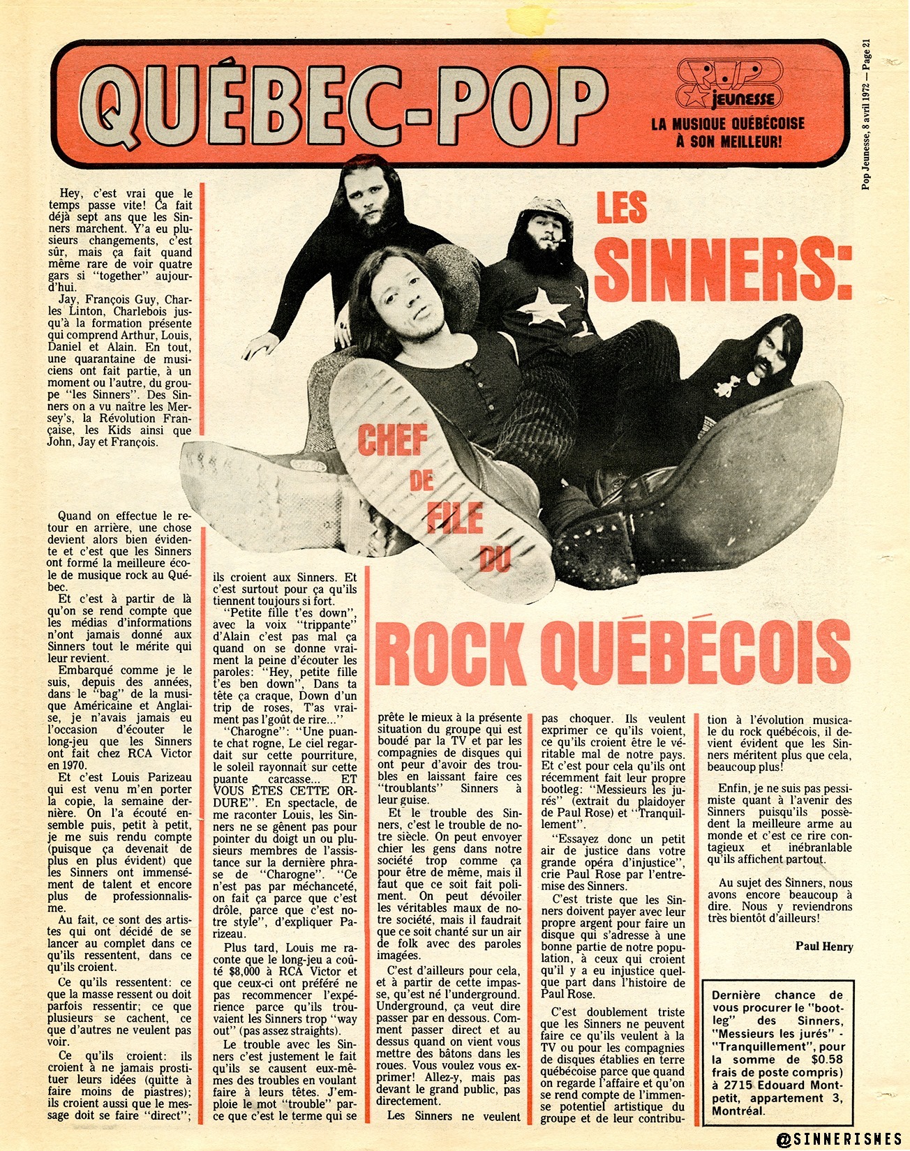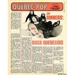 A 1972 Pop Jeunesse feature described the Sinners as “the simplest yet hardest band to define,” a group that thrived in contradiction—underground but universal, humorous yet deadly serious. Parizeau summed it up best: “We’re Québec tavern guys. We’ll never be huge, but we’ll be huge in small places.”