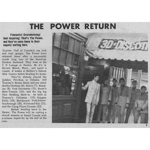 During its first year, the band established a solid fan base on southern Ontario’s dance circuit, billed either as E. G. Smith & The Power or as Grant Smith & The Power. Shortly after a June 27, 1967 show at the Broom and Stone in Scarborough, a Toronto suburb, Charlie Miller left the band. With the lineup reduced to a single drummer, Wayne Stone cut his teeth in the solo drummer chair at a week-long summer resort gig in Grand Bend, Ontario, after which the band headed to the United States, spending 1967’s famous “Summer of Love” working clubs in the Boston area and in upstate New York. On the band’s return to Toronto in early September, Jim Pauley left the band and was replaced by guitarist Jon Palma.