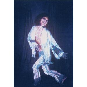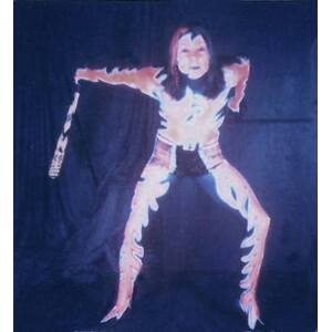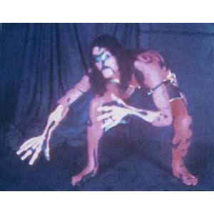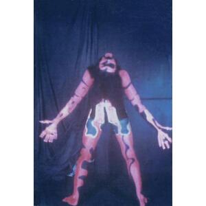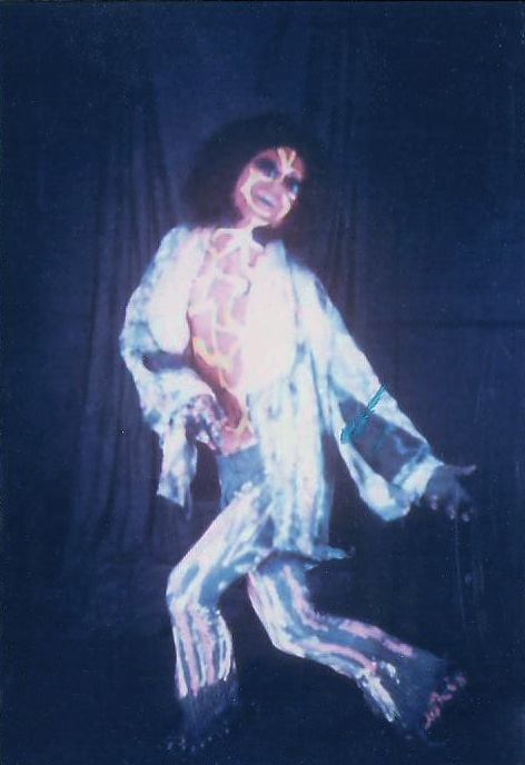 Our change to the show was such a hit we kept it in and built on it over the next year. First we changed to fluorescent paint and started painting our hands as well. Then we painted all our stage equipment then added black lights and a strobe light (very popular in dance halls). Eventually we incorporated a Liquid Light show as well, which had been becoming the "in thing" with West Coast groups. The first night we added the black lights we were even amazed at the results. But we couldn't stop there! We decided to make ours a visual show as well as musical one and built the whole last set around the paint and black lights. We planned the last set to be a build up from an easy opening to an energetic and thunderous ending. Two of the members (Nick and Jim) started wearing swimsuits and we painted their whole bodies. We put the Zappa tune at the end and we would all wear robes in the last set with the body paint hidden underneath.