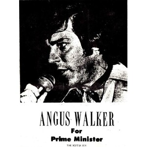 In the 1970's, Angus began recording working with Ben Kerr in various capacities who helped him to make advances in promoting his career under the stage name of "The Prime Minister of Country Music". This name comes from a song Kerr wrote called "Parliament Hill" which in addition to other events, helped him to gain more exposure. Kerr was planning on having Angus run in the US election after recording "Washington D.C." until Angus suggested doing so in Canada instead. Shortly thereafter, Kerr had written the song which was promptly recorded and different versions were included on a single and an album. Angus toured prolifically during the time, performing not only at venues across Canada like McKoys in Gaspe and the Monteray Club in Montreal, but also in Hawaii where he met Steve Lau who eventually joined him back in Canada as the lead guitarist for his new band "The Cabinet" along with Henry Brennan on bass and Larry Brennan on drums. He gained more attention due to the controversial nature of "Parliament Hill", when the Government of Canada enacted legislation banning the further use of the title of the song for commercial use. At this point, Angus' musical style was mostly country inspired with other genres influencing him as well. Along with recordings on several compilation, albums and singles, including many that Angus wrote and other popular songs from the the time period, in 1973 he recorded and released "Introducing Angus Walker: Canada's Prime Minister of Country Music " with The Cabinet in anticipation of the extensive touring that would follow.
