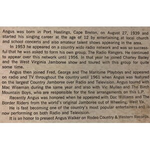 Angus Reynolds Walker is a timeless musical talent who has recorded, wrote and played many genres over the years and is one of the most accomplished early Nova Scotian pioneers of bluegrass music. He has mostly focused on playing rhythm guitar and lead vocals but has experience with other instruments such as the fiddle and dog house base in addition to singing harmony on a few occasions. His early musical inspirations were Johnny Paycheck and Jimmy Martin among a multiplicity of others, some of whom Angus has had the pleasure to meet or briefly play with over the course of his career. Angus first started playing guitar at the age of ten and during the next few years, Angus developed his musical talents and made his first recordings including "The White Rose" which is a traditional Cornish folk song during his early adolescence.