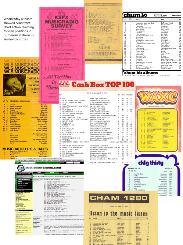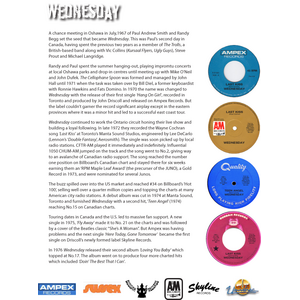 The buzz spilled over into the US market and reached #34 on Billboard’s ‘Hot 100’, selling well over a quarter million copies and topping the charts at many American city radio stations. A debut album was cut in 1974 at Manta Sound, Toronto and furnished Wednesday with a second hit, ‘Teen Angel’ (1974) reaching No.15 on Canadian charts.