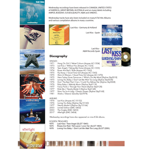 Wednesday’s complete catalogue was re-release in 2003 on Unidisc Music, Quebec, with the addition of two unreleased tracks, ‘House of the Rising Sun’ and ‘The Sun Ain’t Gonna Shine’ Also three compilation CDs were released in 2004 - ‘Limited Edition’ , ‘The Singles’ and ‘Afterlight’ in 2017.