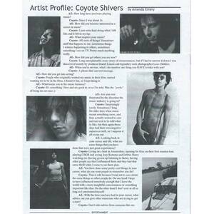 Returning to New York City, he enlisted Billy Ficca on drums (Richard Hell and The Neon Boys' drummer, not to mention a member of the seminal New York band Television). Jack Pedler' eventually took over on drums, and along with Dagon Spector on bass, Coyote released his first solo album (the self titled "Coyote Shivers"), critically acclaimed by a diverse spectrum of media, ranging from Billboard Magazine to Screw Magazine, and from Sassy to High Times. Debbie Harry's bass player, Greta Brinkman, eventually took over on bass guitar, until Coyote formed his most recent lineup featuring Chad Stewart (Faster Pussycat) on drums, and Casper on bass. Greta went on to then play bass for Moby. After a stint as the opening act on the KISS reunion tour, Coyote began writing songs for his forthcoming second album, releasing limited edition CD singles and the 5-song CD "1/2 a Rock & Roll Record", spending most of his time between Hollywood and New York City. Coyote recently finished starring in Down and Out with the Dolls (2001) directed by Kurt Voss and also starring Lemmy of Phil Campbell and Inger Lorre of the Nymphs. Coyote also just finished starring in director Luis Aira's Girl in 2003.
