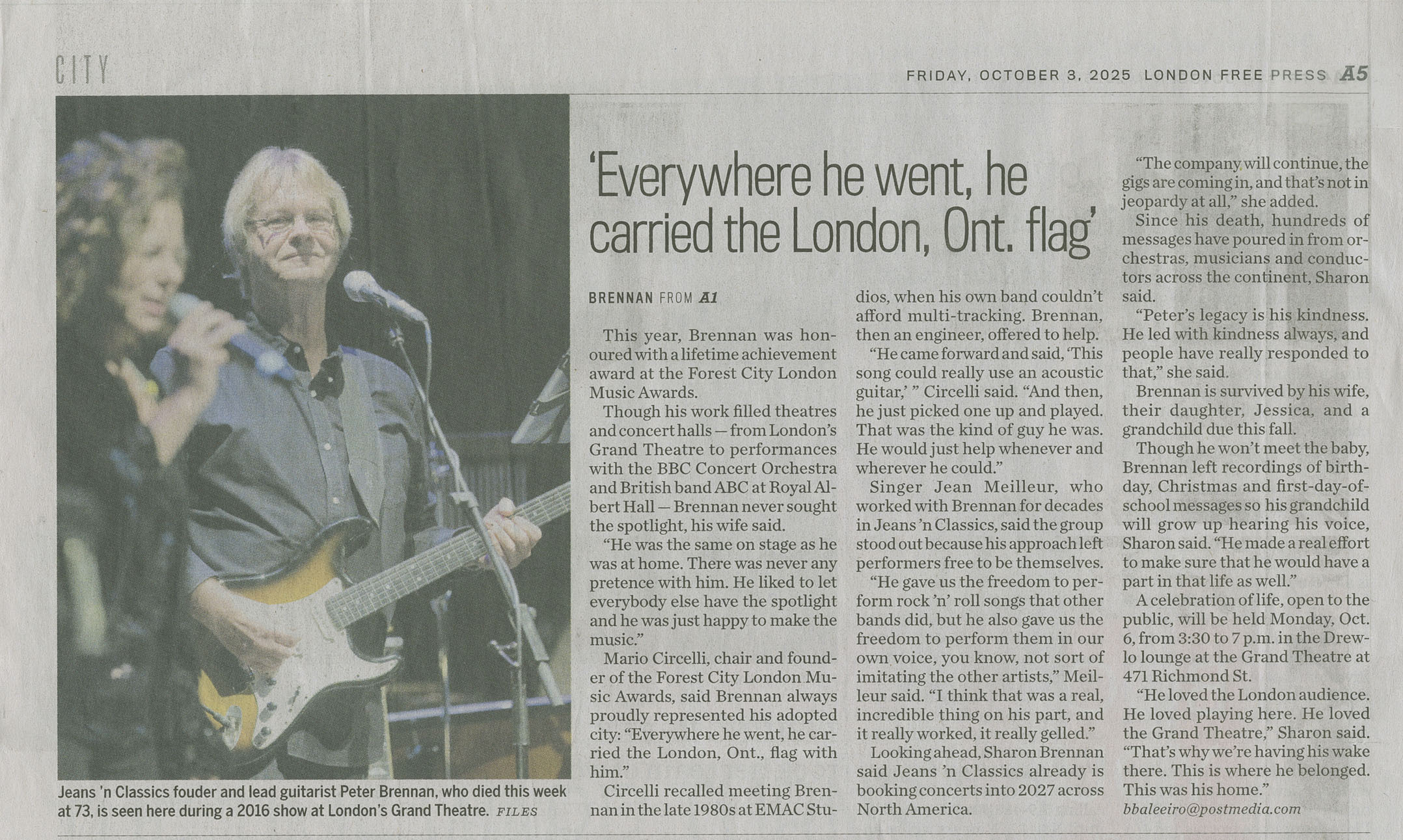 Peter Brennan (December 10, 1951 – September 29, 2025) was a Canadian guitarist, producer, arranger, and musical director whose career bridged popular music, studio production, and large-scale orchestral collaboration. Best known as the founder and creative force behind Jeans ’n Classics, Brennan also played a pivotal behind-the-scenes role in shaping the sound and direction of numerous Canadian artists from the early 1980s onward, particularly through his work at London, Ontario’s EMAC Recording Studios.