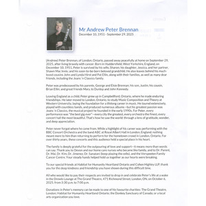 In later years, Brennan’s achievements were formally recognized with numerous honours, including a Lifetime Achievement Award from the Forest City London Music Awards, and induction onto Western University’s Don Wright Faculty of Music “Wall of Fame.” Yet those closest to him consistently noted that he avoided the spotlight, preferring to support others and let the music speak for itself.