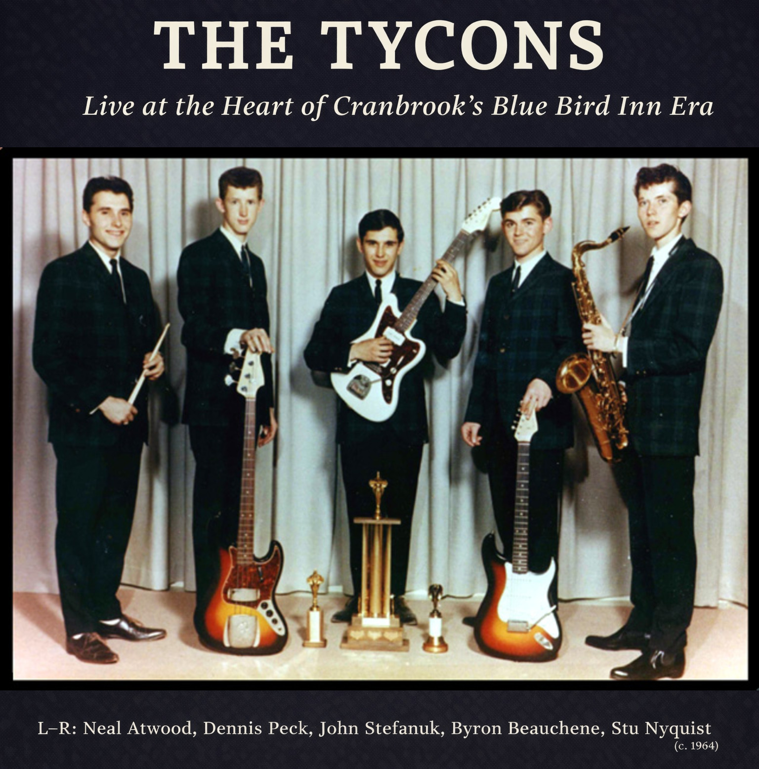 The group’s core lineup during its most active period included John Stefanuk (lead guitar), Byron Beauchene (rhythm guitar, lead vocals), Dennis Peck (bass, vocals), Stuart Nyquist (saxophone), and Neal Atwood (drums, vocals). Bruce Frost was the group’s original bass player and a founding member, later replaced by Dennis Peck as the band evolved. Atwood was a founding member of the Tycons and served as drummer and vocalist during the band’s formative early-1960s period, helping establish the group on the regional circuit.