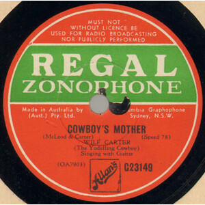 Wilf (Wilfred Arthur Charles) Carter. Singer-songwriter, guitarist, b Port Hilford, on the Atlantic coast of Nova Scotia, 18 Dec 1904, d Scottsdale, Arizona, 5 Dec 1996. Inspired by a touring Swiss yodeller, Carter began to sing as a boy. After working as a lumberjack he went to Alberta in the early 1920s and became a cowboy, but also entertained at dances and performed for tourist parties travelling in the Rockies. He made his radio debut on CFCN, Calgary, in 1930 and was later heard locally on CFAC, and nationally on the CRBC. About 1932 he recorded for RCA Victor in Montreal; his first 78, comprising his songs 'My Swiss Moonlight Lullaby' (which featured a yodelling style now influenced by the US singer Jimmie Rodgers) and 'The Capture of Albert Johnson,' was popular - indeed, the first hit record by a Canadian country performer. Many of Carter's early songs were published by Thompson between ca 1933 and 1949 in several volumes individually titled Cowboy Songs, More Cowboy Songs, New Cowboy Songs, etc.