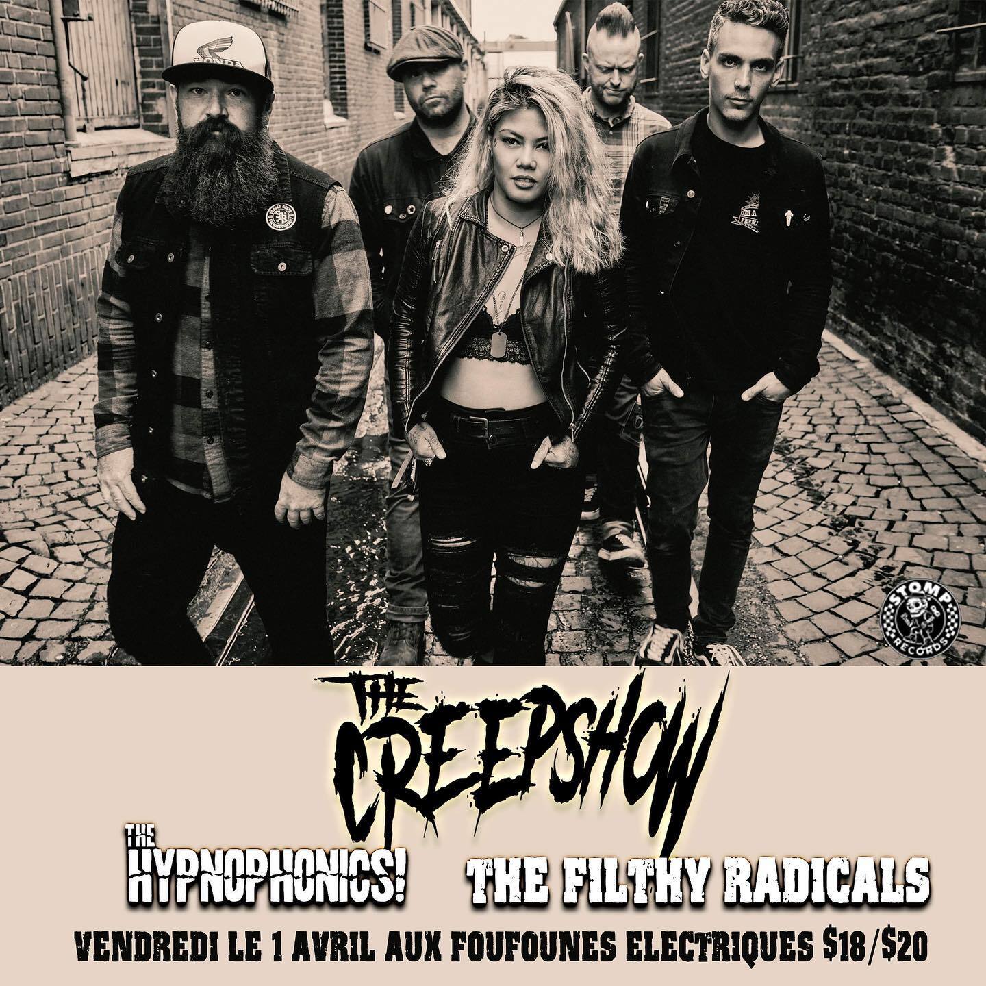 For the past 13+ years The Creepshow have been smashing the whole damn world in the face with their brutaltastic mélange of punk, country, psychobilly and good old-fashioned rock n' roll. They've toured the world, sold a metric shit-ton of records, garnered millions of video views and blown the faces off a ga-zillion fans. The Creepshow has performed in more than 50 countries and shared the stage with Rancid, NOFX, Dropkick Murphys, Tiger Army, Sham 69 and Reverend Horton Heat just to name a few… But the road to infamy hasn't always been paved with accolades and sold out shows. Over the years, the band has been fraught with innumerable hardships along the way. From robberies and wrecks to line-up changes and countless personal obstacles, the band has lived through it all. And they always come out on top. With the debut of their first album “Sell Your Soul” in 2006, The Creepshow was immediately catapulted to the forefront of the bourgeoning international psychobilly/punk scene and opened the door for them to bring their eye and ear scorching live show to the four corners of the earth. The release of “Run For Your Life” (2008 Epitaph/Stomp), “They All Fall Down” (2010 Epitaph/Stomp) and “Life After Death” (2013 Stomp/Sailors Grave) further cemented the band as one of the most impressive, critically acclaimed and well-respected touring acts out there.