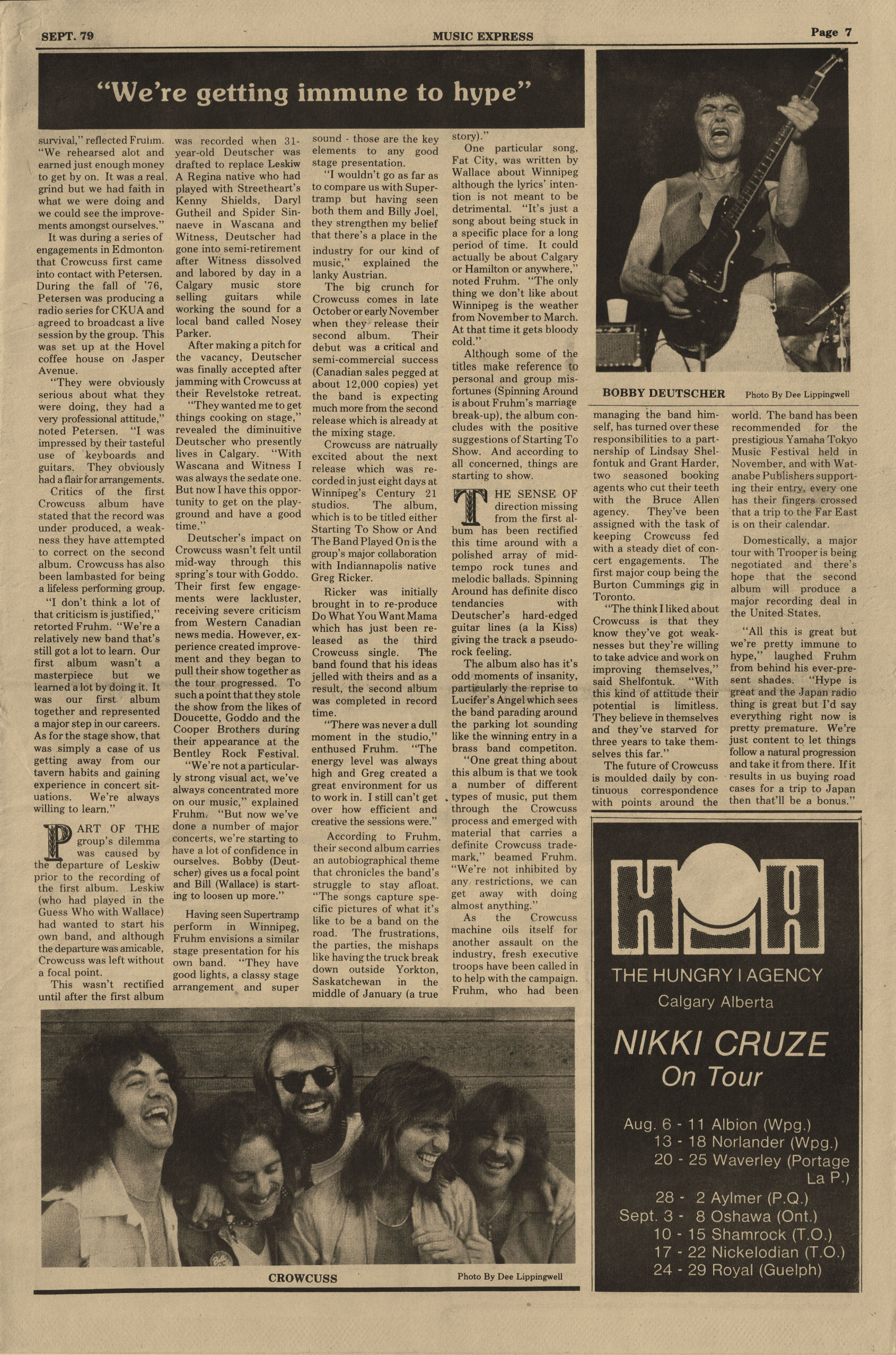 Stony Plain Records' label boss Holger Petersen financed recording a full-length album at Mushroom Studios in Vancouver. At the time of recording their 1979 debut, the band lineup was Bill Wallace, Larry Pink, Marc La France, and Hermann Fruhm. The appropriately titled lead-off "Running Start" was released as a 7" single and would turn out to be their biggest hit, earning a number one in Guatemala. Crowcuss toured extensively, opening for Burton Cummings, Prism, Goddo, Doucette, and Streetheart, but couldn’t crack the radio charts. Crowcuss recorded and released the follow-up Starting To Show in 1980 in Winnipeg, this time including guitar player Bob Deutscher. With little traction off the second album, the group soon disbanded and went on to other projects.
