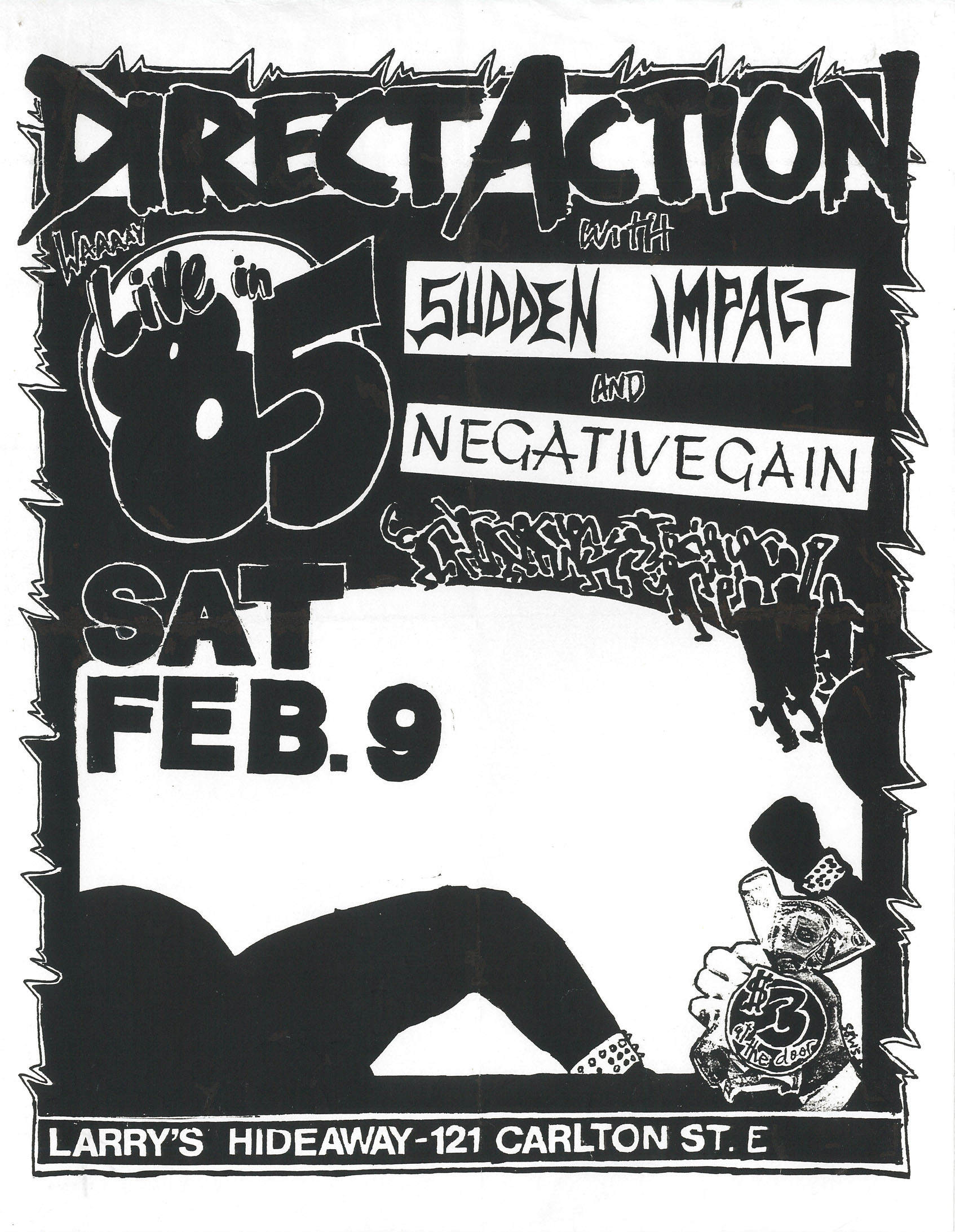 1985-02-09_Direct Action + Sudden Impact + Negative Gain_Larry_s (Toronto)_Live In 85 flyer_+