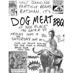 Dog Meat BBQ made their first public appearance in June 1986 at the Peace-a-Chord, an annual alternative music festival held in Bannerman Park, St. John's. As Justin was unavailable for this gig, drumming duties were performed by Danny Thomas, who would later go on to play in The Thomas Trio and the Red Albino.