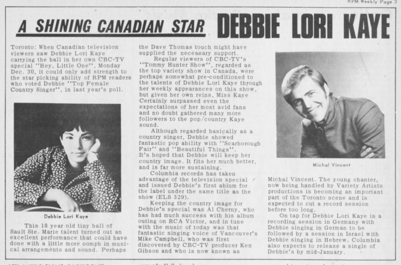 In 1969, Debbie starred in her own CBC-TV special titled Hey Little One, featuring pop arrangements of songs like Scarborough Fair and Beautiful Things. Supporting artists included Al Cherny and Vancouver’s Mike Campbell (later Michal Vincent).