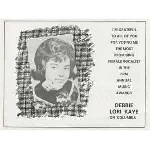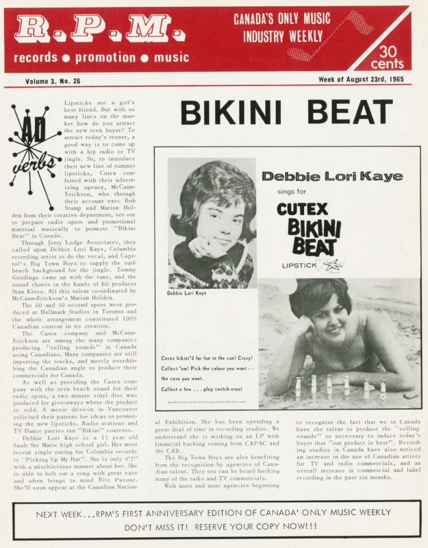 Debbie also appeared in national advertising campaigns, most notably the Bikini Beat jingle for Cutex Lipstick, produced by Stan Klees and backed by The Big Town Boys — another Canadian first that gave her cross-border radio exposure.