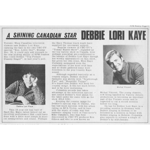 In the summer of 1965, Debbie made her national debut at the Canadian National Exhibition (CNE) Grandstand Show, performing in Sights and Sounds of the Sixties - a lavish musical revue produced by Jack Arthur. Debbie had auditioned in Toronto through agent Gerry Lodge, singing Patsy Cline songs on her oversized guitar. Accepted immediately, she was billeted with the Ross family, where daughter Hillary, a “Wildcat” dance troupe member, taught her choreography. Debbie, who had never danced before, recalled being “scared silly,” but embraced the challenge.