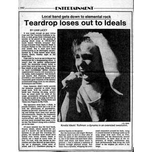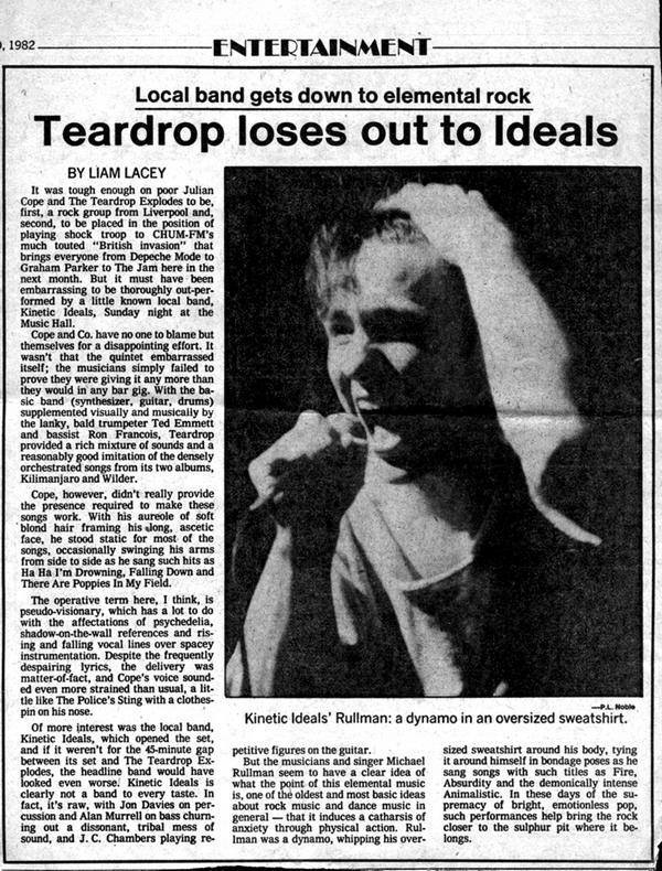 As the band moved into the club circuit, their reputation grew quickly. Live audiences reacted to the group’s physicality as much as their music; Rullman often treated the stage like a provocation, twisting himself in oversized sweatshirts, throwing his body into the rhythm, and pushing performances toward a kind of physical breaking point. Reviews from the period consistently describe the group as the most arresting presence on multi-band bills. In one notable case, covering a Music Hall show, a local critic observed that Kinetic Ideals “out-performed” the visiting U.K. band The Teardrop Explodes—a rare moment in which a Canadian opening act eclipsed an international headliner during Toronto’s early “British invasion” marketing push.