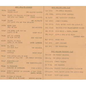 The first release was "Party Doll", and then at almost the same time Roulette released "I’m Sticking With You". With "Party Doll" going number one and selling well over a million singles and "I’m Sticking With You" being a top 40 hit and single sales over one million, the band was on top of the world. That same year Buddy Knox and the Rhythm Orchids released "Rock Your Little Baby To Sleep", a top 20 hit, and "Hula Love", a top 10 hit. Both singles sold over one million copies.
