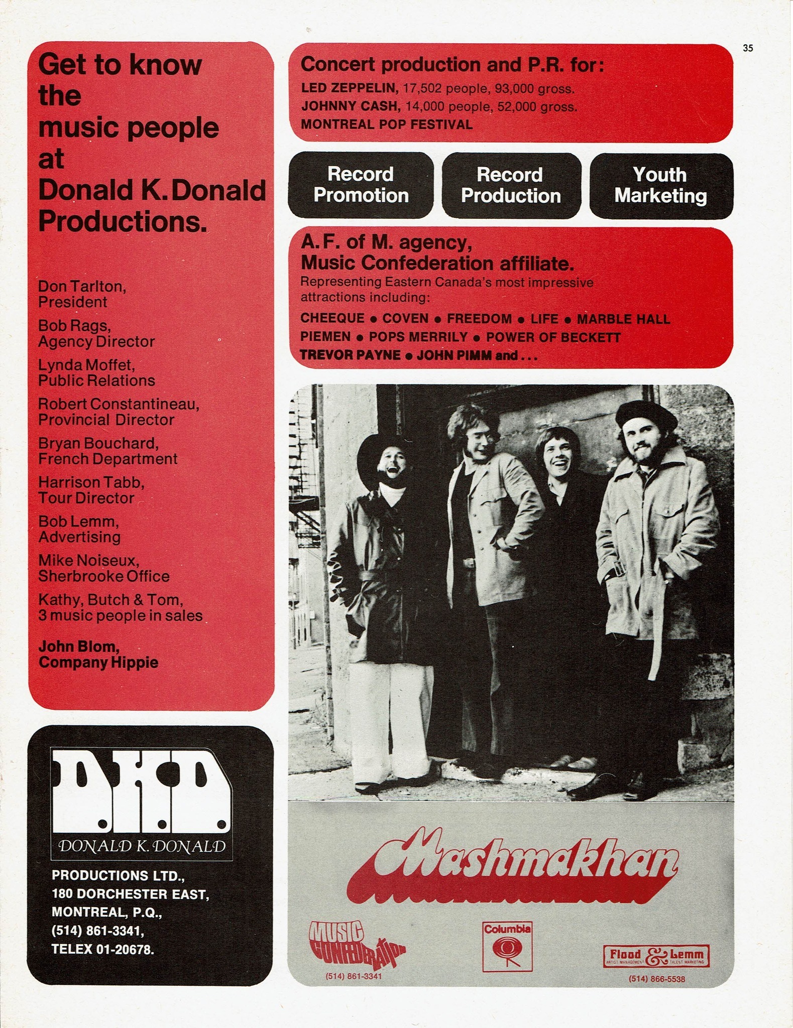 Mashmakhan. Montreal rock band. It evolved from a succession of groups in the 1960s - eg, the Phantoms, the Dominoes, and Triangle, the last backing R&B singer Trevor Payne - that included the songwriter Pierre Sénécal (vocals, keyboards, flute), Rayburn Blake (guitar), and Jerry Mercer (drums). On leaving Payne, the trio made their debut in February 1969 at a Montreal club, the Laugh In, and soon after gave the first rock concert heard at the NAC. The bass guitarist Brian Edwards was added, and the name of an exotic hallucinogen adopted, prior to the release in 1970 of the band's first LP, Mashmakhan (Col ELS 365).