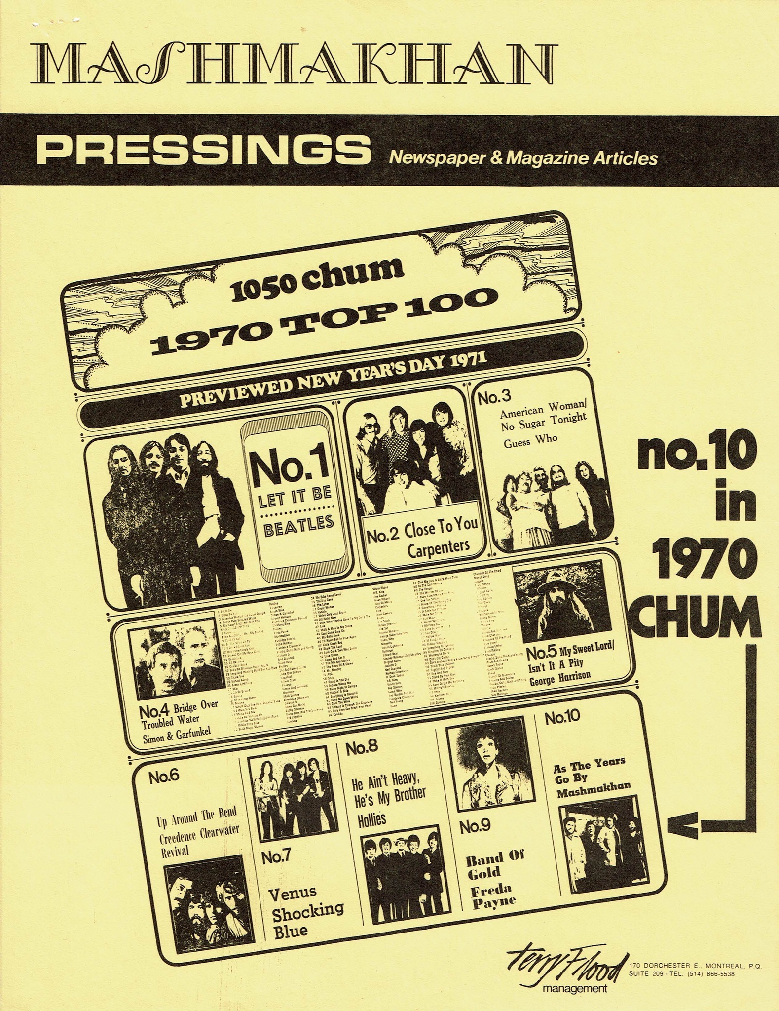 The international success of the single 'As the Years Go By,' a pop song atypical of the band's venturesome, improvisational style, led to concerts in the USA and Japan, including a Tokyo appearance in 1971 before an audience of 40,000. A second album, Family (Epic E30813), was issued in 1971. Mashmakhan disbanded soon after. Efforts to revive the group during the mid-1970s involved, variously, Sénécal, Allan Nichols (vocals), Brian Greenaway (guitar), Steve Lang (bass), Lorne Nehring (drums), and others, and further singles were issued by Aquarius Records.