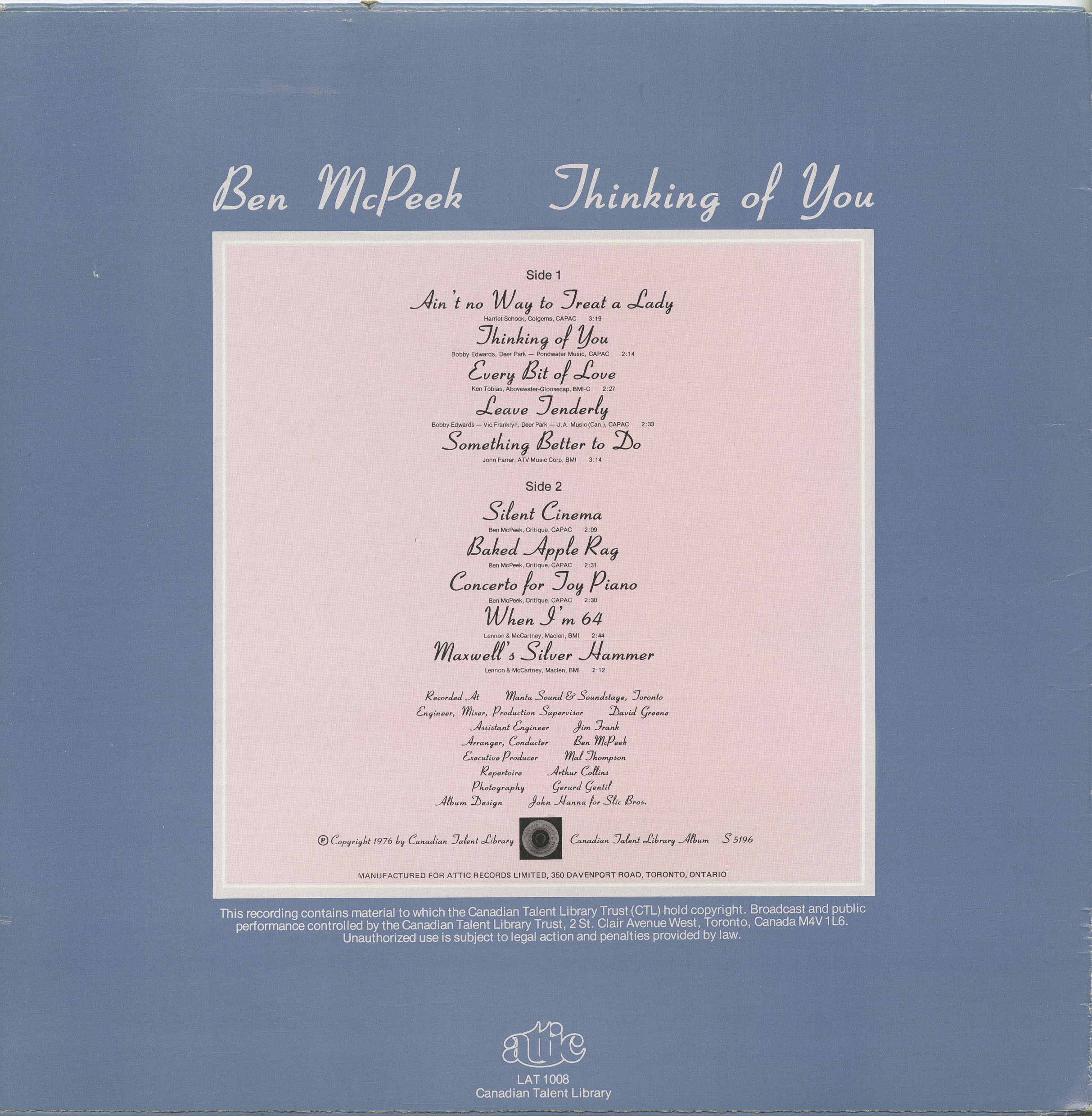 His first recorded album work came through the Canadian Talent Library. In 1966, McPeek released Colourful Configurations Conceived And Conducted By Ben McPeek (CTL M-1080), a mono LP that introduced him as a composer-arranger with a distinctive orchestral voice. The same recordings were subsequently retitled and reissued under various configurations, most notably as The Original Sounds Of Ben McPeek, His Voices And His Orchestra, appearing on Canadian Talent Library, RCA Victor, and later RCA Camden. These releases form the foundation of McPeek’s recorded catalogue and document his early orchestral and ensemble writing.