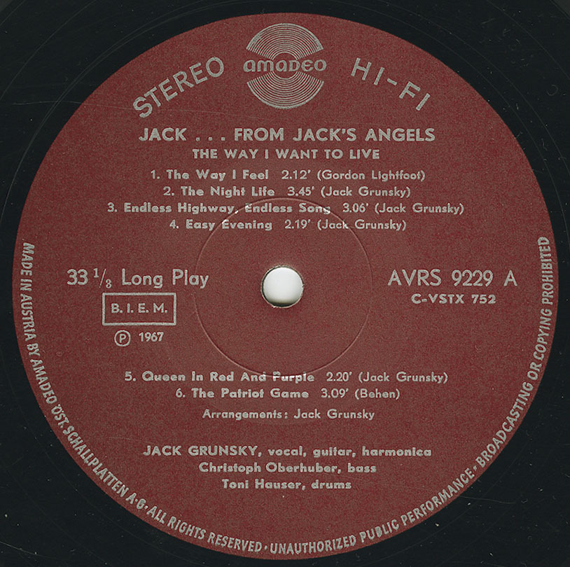 After high school, Jack returned to Austria and attended the Academy of Arts in Vienna. It was during his art school years that his music career began to flourish. In 1966, he formed Jack’s Angels, a folk group that recorded four successful albums with Amadeo Records in Vienna. After the group disbanded, Jack continued as a solo artist, releasing three albums: The Way I Want To Live, My Ship, and Toronto (produced by Alexis Korner and featuring Mick Taylor of the Rolling Stones).