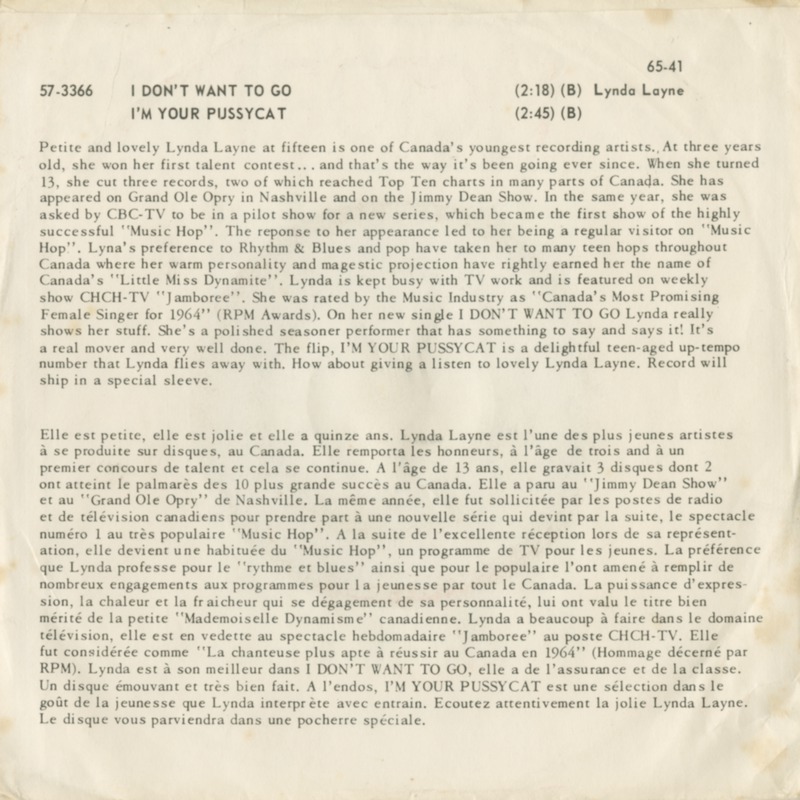 Soon adopting the stage name Lynda Layne, she quickly found her footing in the Canadian music scene through television. She became a regular on CBC’s Music Hop beginning in 1964 and appeared on programs like Juliette, Teen ’67, and CHCH-TV’s Jamboree. That same year, she was named “Most Promising Female Vocalist” by RPM Weekly—Canada’s premier music industry journal.