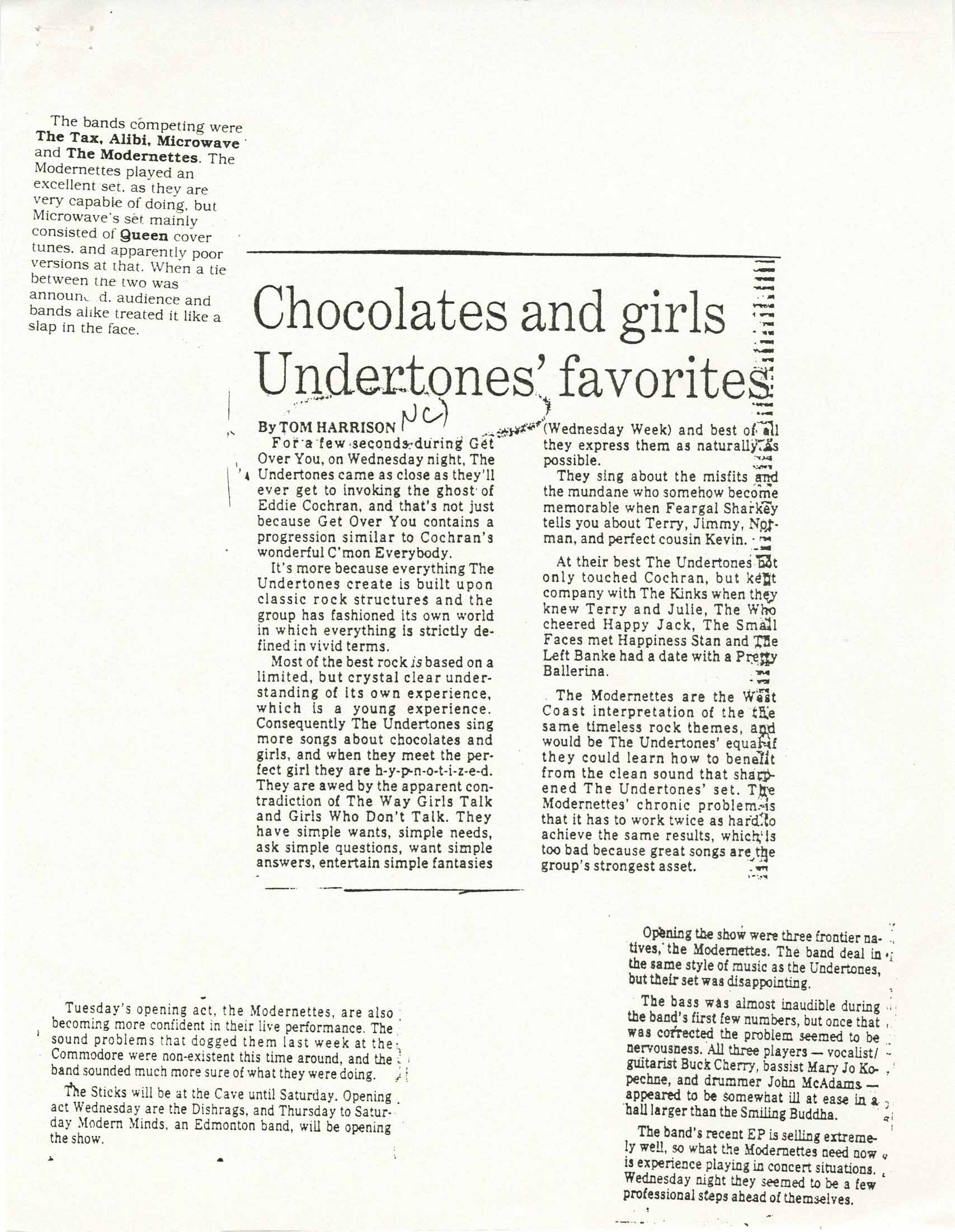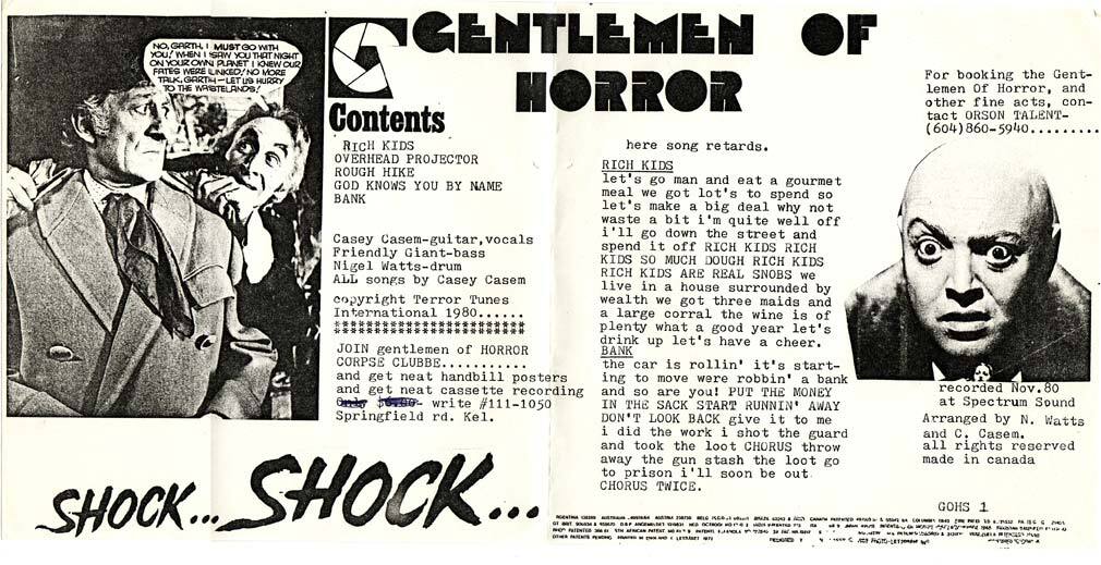54-40, A Merry Cow, Actionauts, Active Dog, Active Glands, Aircuts, AKA, AKOB, Animal Slaves, Bad Attitude, Beauty Foundation, Belgianiques, Big Black Puppets, Biz, Blood BBQ, Bob’s Your Uncle, Bolero Lava, Bonus Boys, Braineaters, Brilliant Orange, B-Sides, Cannon Heath Down, Celebrity Drunks, Clay Pigeon, College, Joe & the Rulers, Corsage, Culture Shock, D.O.A., Death Sentence, Dishrags, Droogs, Electric Purple Carrot, Emily, Enigmas, Exxotone, Family Plot, Female Hands, Furies, Gentlemen of Horror, Go Four 3, Herald Nix, House of Commons, I, Braineater, Idyle and Undesirable, Immoral Minority, Industrial Waste Banned, Insex, K-Tels, Los Popularos, Lost Durangos, M.E.C., Mecca Normal, Metros, MIA, Modernettes, Moral Lepers, Motive, NG3, No Exit, No Fun, Nomeansno, Ominous Cinema, Otis Dog, Oversoul Seven, Payola$, Phil Smith, Pointed Sticks, Poisoned, Popular Front, Private School, Rampage, Randy, Rhythm Mission, Rude Norton, Sam, Scissors, Secret V’s, Sexual Infections, Shanghai Dog, Shriek, Si Monkey, Siggy Magic & the Hey-Hoe Band, Singing Cowboys, Slow, Soldiers of Sport, Soreheads, Stab ’Em in the Abdomen, Stiffs, Subhumans, Sudden Impact, Taro, The Actionauts, The Bill of Rights, The Dishrags, The Enigmas, The Furies, The Generators, The Hip Type, The Krauts, The K-Tels, The Modernettes, The Scramblers, The Shades, The Skulls, The Spores, The Stiffs, The Work Party, Tim Ray & A.V., Tim Ray and the Druts, UJ3RK5, Unknown Fibres, Unnatural Silence, Wasted Lives, Young Canadians, Zellots.