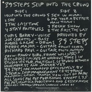 39 Steps came together in Montréal in 1984 when Chris Barry—fresh off the wreckage of The 222’s and a harrowing London stint—reunited with Pierre Major (guitar) and Joe Cerratto (bass), adding Richard Paul (guitar) and André Gagné (drums). Where the 222’s were a teenage punk broadside, 39 Steps sharpened the edges into something darker and cinematic: hard-charging, goth-tinged rock built for midnight clubs and last-chance shots. Within six months they were at Studio Victor cutting a self-titled EP for Line Records, with “Slip Into the Crowd” and “Sex in Miami” announcing the band’s balance of menace and melody. A move to New York under manager Steven Shipp followed, and an audition landed them on screen in Woody Allen’s Hannah and Her Sisters, performing “Slip Into the Crowd” at CBGB—an era that brought MTV rotation and a 1987 full-length, Slip Into the Crowd (RCA/TGO), before the major-label gears ground to a halt.