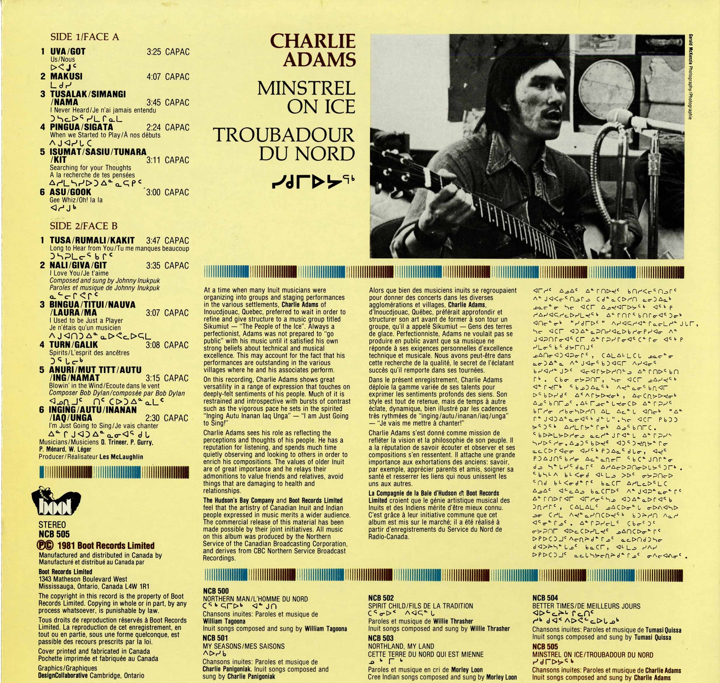 Charlie Adams sees his music as reflecting the experience of Inuit his age. He feels that he has had to find his identity not only in the bush and settlement but also in the classroom and city. In this project, he sings about his pride in the Inuit past and his people’s future, and about the paradoxes and problems of his own personal life.