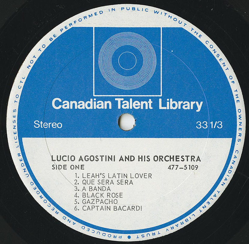 Latin American music has long been a specialty of Lucio Agostini, and the Canadian Talent Library is pleased to present this new album which has not only been especially arranged and conducted by Mr. Agostini, but features three of his own compositions, recorded for the first time . . . “Leah’s Latin Lover”, “Caramba” and “Black Rose”.