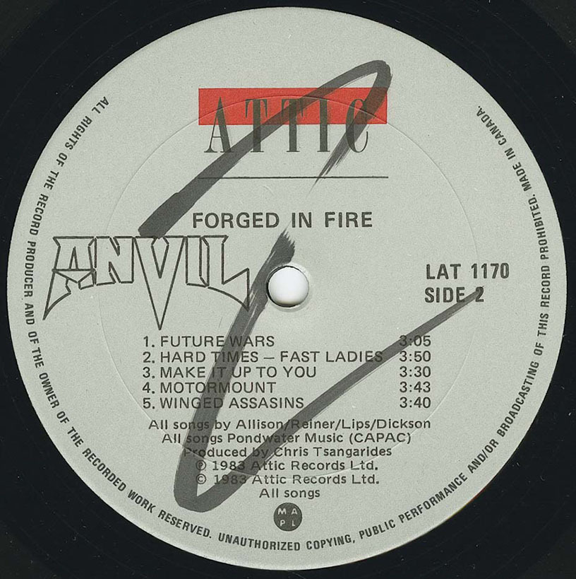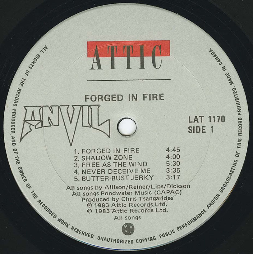 Forged in Fire is the third studio album by Canadian heavy metal band Anvil, released on April 13 1983. The album was produced by Grammy-nominated producer Chris Tsangarides (Judas Priest, Black Sabbath, Thin Lizzy). The band's influence on notable heavy metal groups Megadeth, Slayer, Anthrax, and Metallica is evident in the heavy riffs of the title track and the blistering blast beats on "Butter-Bust Jerky" and "Motormount." Anvil! The Story of Anvil (2008), an Emmy-winning documentary about the band by director and former Anvil roadie Sacha Gervasi, has been lauded as one of the greatest "rockumentaries" ever made.