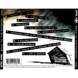 Back To The Mansion is April Wine's 18th album in their 31-year career as a band and features original members Myles Goodwyn (vocals, guitars and keyboards), Brian Greenway (guitars, vocals), Jim Clench (bass, background vocals), Jerry Mercer (drums).