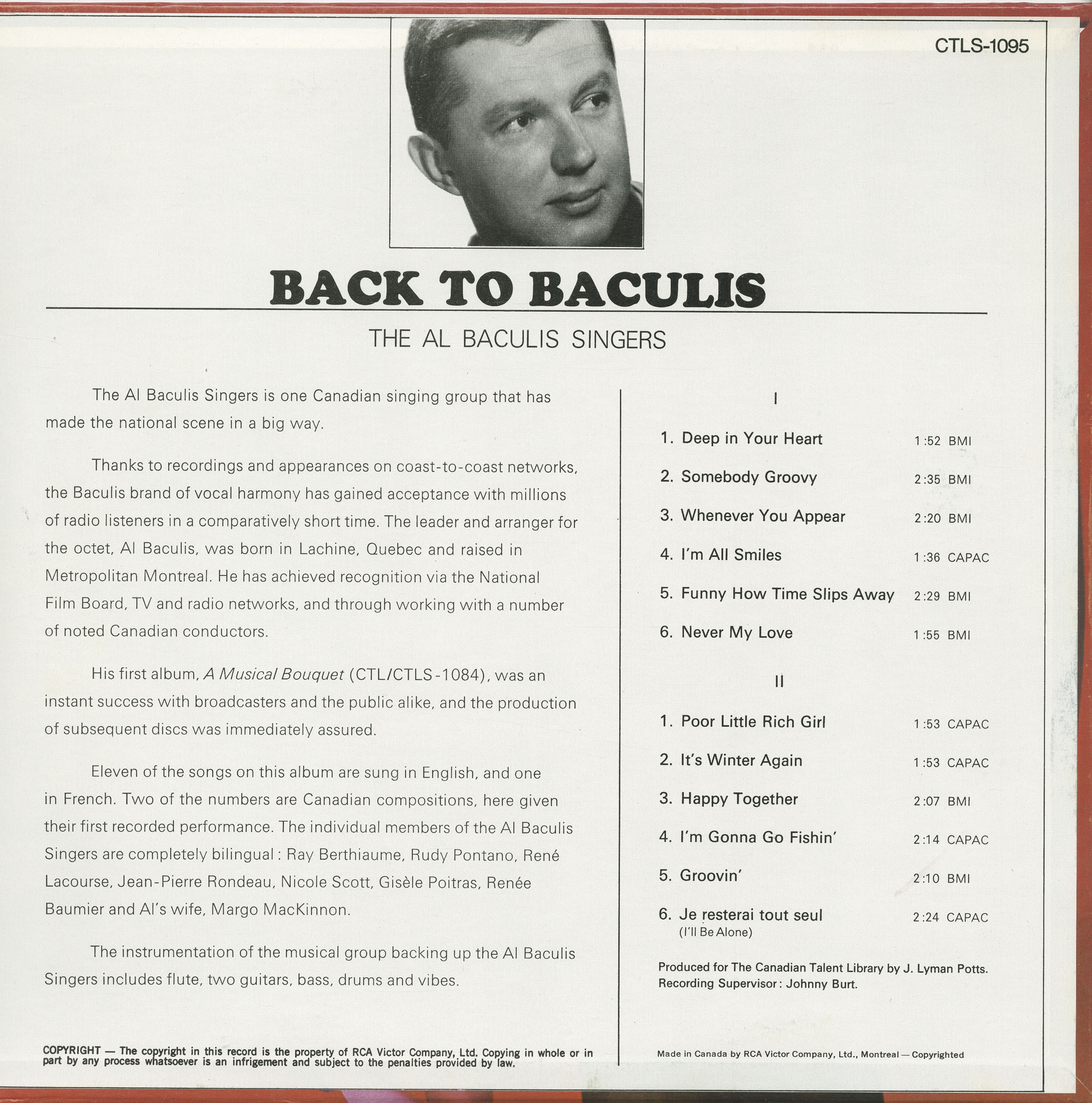 Eleven of the songs on this album are sung in English, and one in French. Two of the numbers are Canadian compositions, here given their first recorded performance. The individual members of the Al Baculis Singers are completely bilingual: Ray Berthiaume, Rudy Pontano, René Lacourse, Jean-Pierre Rondeau, Nicole Scott, Gisèle Poitras, Renée Baumier and Al’s wife, Margo MacKinnon.