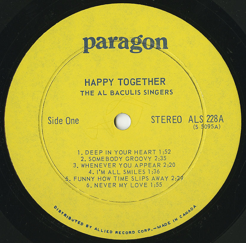 In the mid-1960s Baculis founded The Al Baculis Singers, an impeccably blended studio vocal group comprising Ray Berthiaume, Rudy Pontano, René Lacourse, Jean-Pierre Rondeau, Nicole Scott, Gisèle Poitras, Renée Beaumier, and Baculis’ wife, Margo MacKinnon. Bilingual and versatile, they became fixtures on CBC radio and television, known for their lush choral textures and polished phrasing. Their first LP, The Al Baculis Singers (Canadian Talent Library CTLS-1084 / Birchmount BM-528, 1966), introduced Baculis’ sophisticated pop-jazz arrangements to a national audience, followed by Back to Baculis—also issued as Happy Together (CTL CTLS-1095 / Paragon ALS-228, 1967)—and Anne of Green Gables (Dominion 1368, 1967). Blending flute, guitars, bass, drums, and vibraphone with eight vocal parts, these albums showcased a uniquely Canadian approach to the sunshine-pop era: urbane, harmonically rich, and radiantly melodic.
