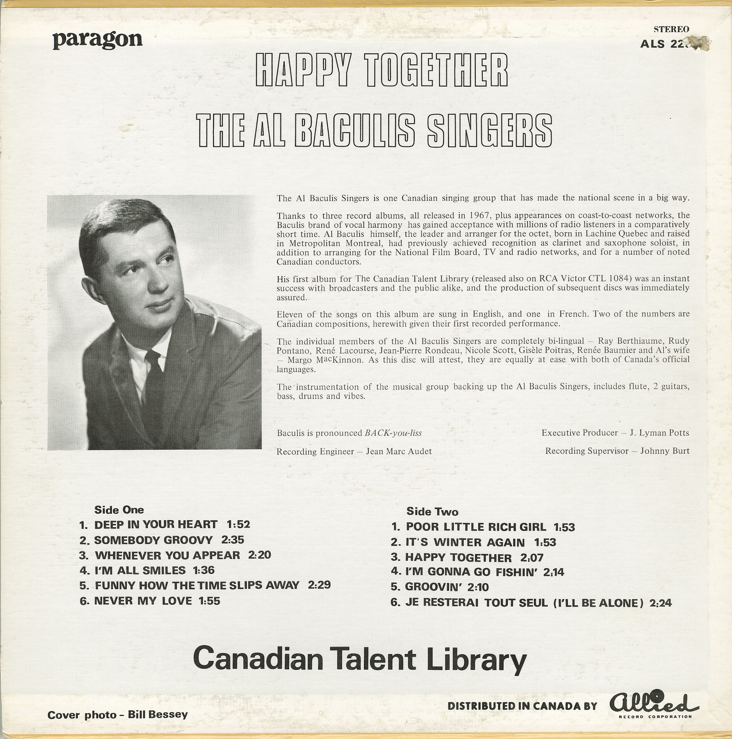 The individual members of the Al Baculis Singers are completely bi-lingual — Ray Berthiaume, Rudy Pontano, René Lacourse, Jean-Pierre Rondeau, Nicole Scott, Gisèle Poitras, Renée Baunier and Al’s wife Margo MacKinnon. As this disc will attest, they are equally at ease with both of Canada’s official languages.