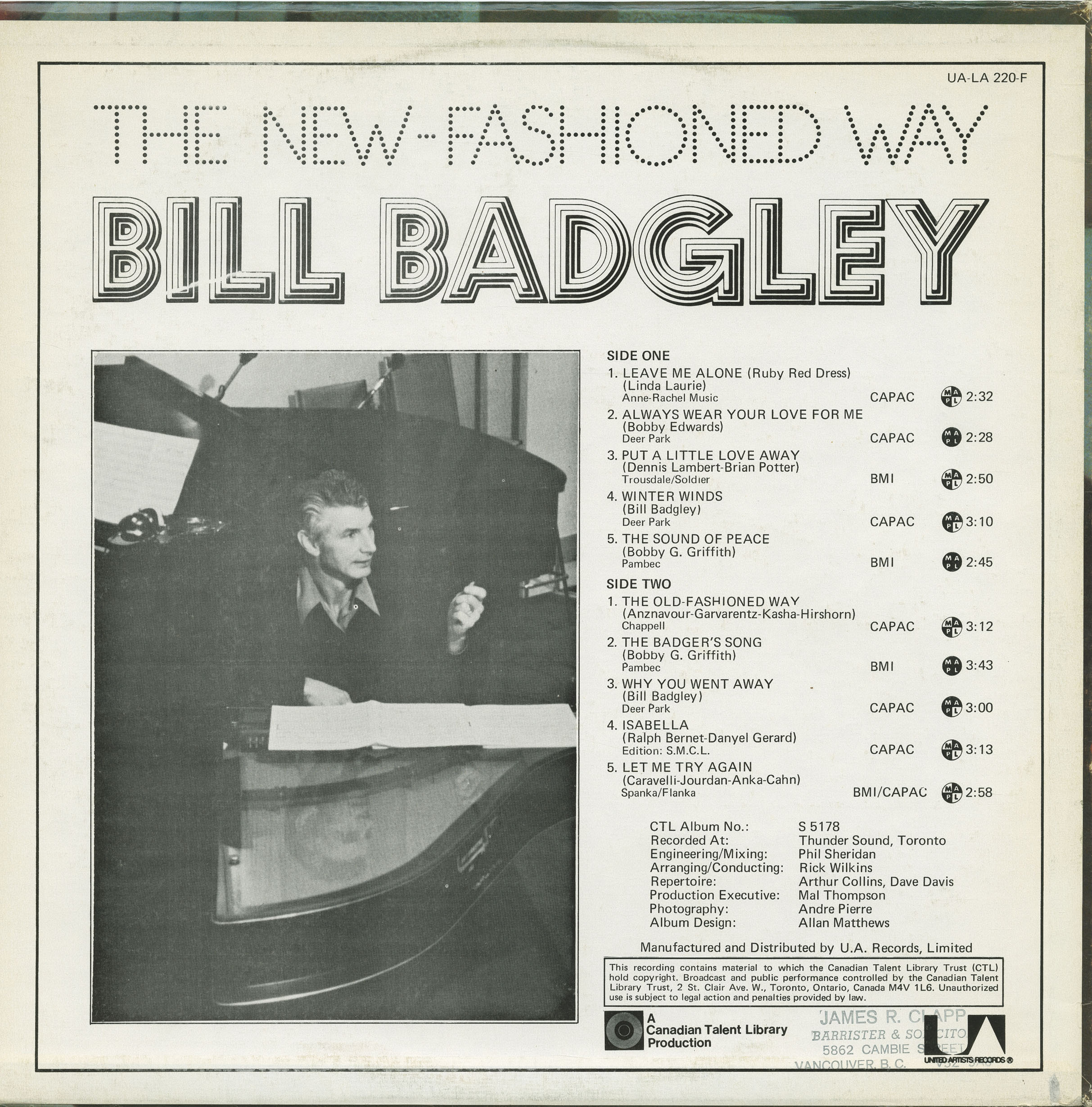 Label: Canadian Talent Library CTL 5178, United Artists Records UA-LA 220-F