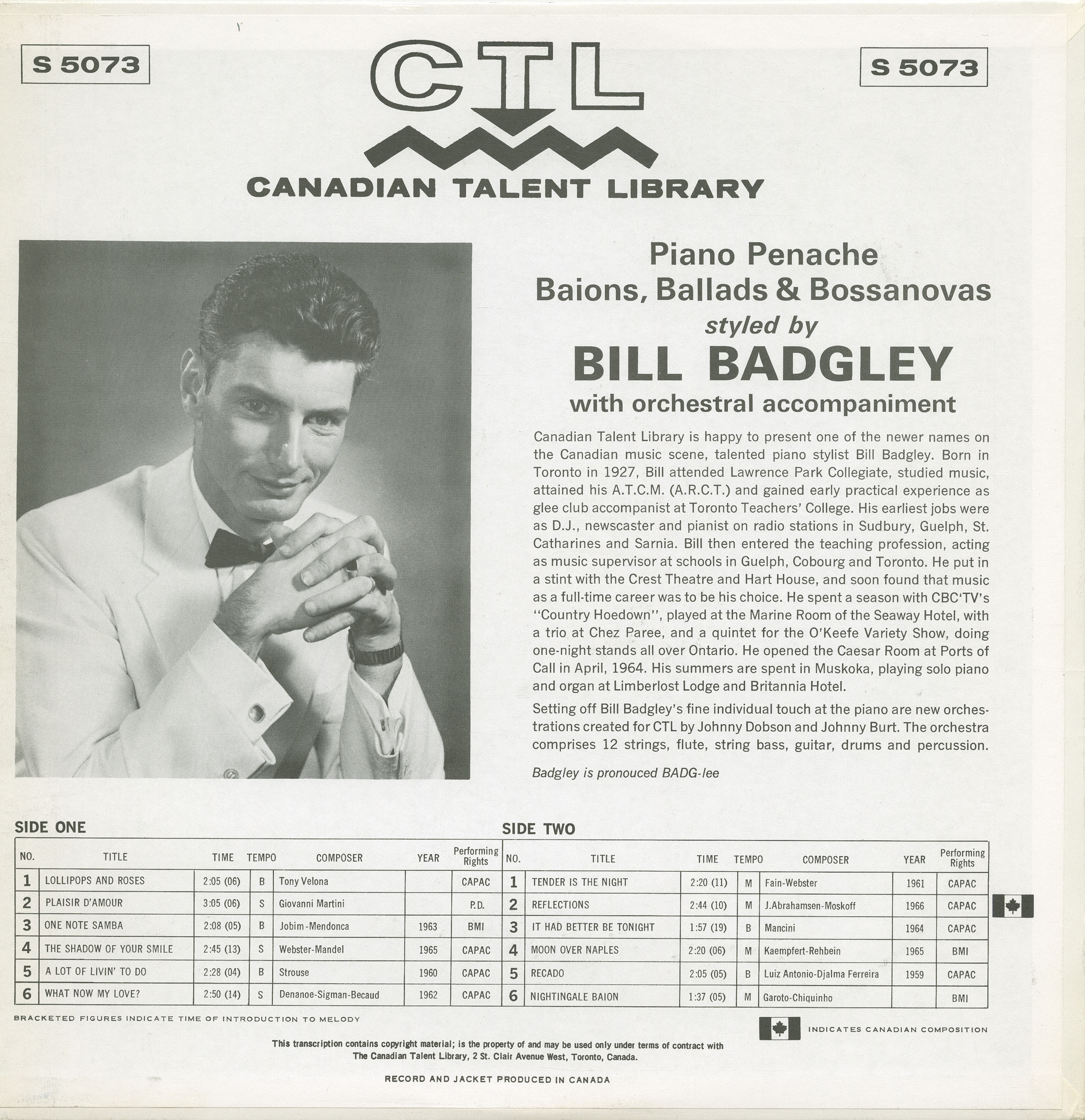 Canadian Talent Library is happy to present one of the newer names on the Canadian music scene, talented piano stylist Bill Badgley. Born in Toronto in 1927, Bill attended Lawrence Park Collegiate, studied music, attained his A.T.C.M. (A.R.C.T.) and gained early practical experience as glee club accompanist at Toronto Teachers’ College. His earliest jobs were as D.J., newscaster and pianist on radio stations in Sudbury, Guelph, St. Catharines and Sarnia. Bill then entered the teaching profession, acting as music supervisor at schools in Guelph, Cobourg and Toronto. He put in a stint with the Crest Theatre and Hart House, and soon found that music as a full-time career was to be his choice. He spent a season with CBC-TV’s “Country Hoedown”, played at the Marine Room of the Seaway Hotel, with a trio at Chez Paree, and a quintet for the O’Keefe Variety Show, doing one-night stands all over Ontario. He opened the Caesar Room at Ports of Call in April, 1964. His summer stints in Muskoka, playing solo piano and organ at Limberlost Lodge and Britannia Hotel.