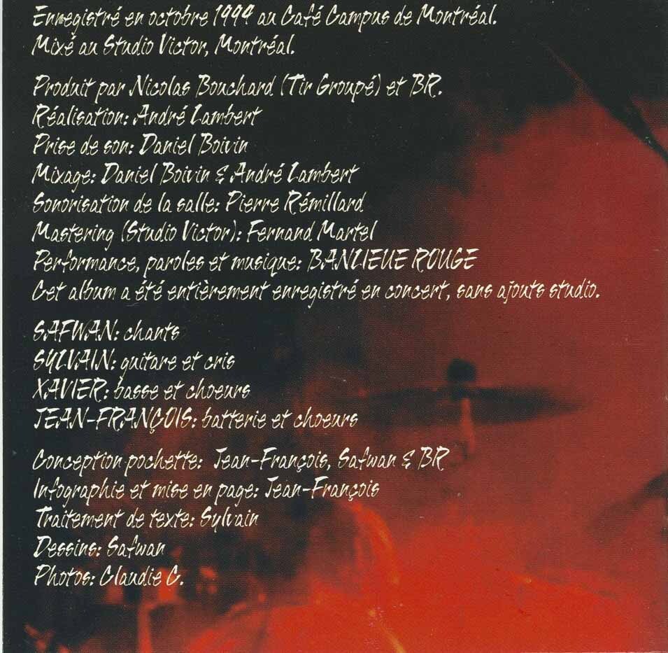 Les jours précédant l’enregistrement public sont le théâtre d’un cambriolage en règle du local de répétition. Tout l’équipement du groupe s’est mystérieusement volatilisé : instruments, amplis, banques de compositions… Crime signé de trois consonnes symboles de haine ou vol crapuleux maquillé, les rumeurs vont bon train pendant que la vérité s’évanouit dans les terrains vagues du quartier Saint-Henri. La solidarité s’organise mais Banlieue Rouge est victime d’un nouveau coup du sort quand le bar où doivent se dérouler les concerts ferme ses portes. Bien décidés à aller au bout de leur idée, les banlieusards déménagent leurs pénates au Café Campus pour trois représentations. À défaut de conditions optimales et malgré l’adversité, ce bilan sonore de cinq années d’activisme musical porte les marques d’une rare authenticité, brute de tout arrangement en post-production. Paru en décembre 1994, cet album tient aussi lieu de sincères salutations aux compagnons de route et de galère. Après quelques dates au Québec pour assurer la promotion du disque, la formation se reprend à survoler l’Atlantique pour une vingtaine d’exactions dans l’hexagone sous une nouvelle formule. Safwan malmène désormais une deuxième guitare pendant que Jean-François achève sa conversion à la batterie. La prestation du quatuor est particulièrement détonante aux Francofolies de La Rochelle et lui vaut les félicitations officielles de la ministre de l’emploi et de la solidarité du gouvernement du Québec. Cette dernière n’a manifestement pas assisté au concert dans la Salle Bleue d’une Coursive où les bancs n’ont pas résisté à l’enthousiasme d’une assistance survoltée. De retour à Montréal et après la parution d’un vinyle de type « best of » en Germanie, Banlieue Rouge concentre toutes ses énergies vers la conception de son prochain album dans lequel certains journalistes iront jusqu’à voir la maturité.