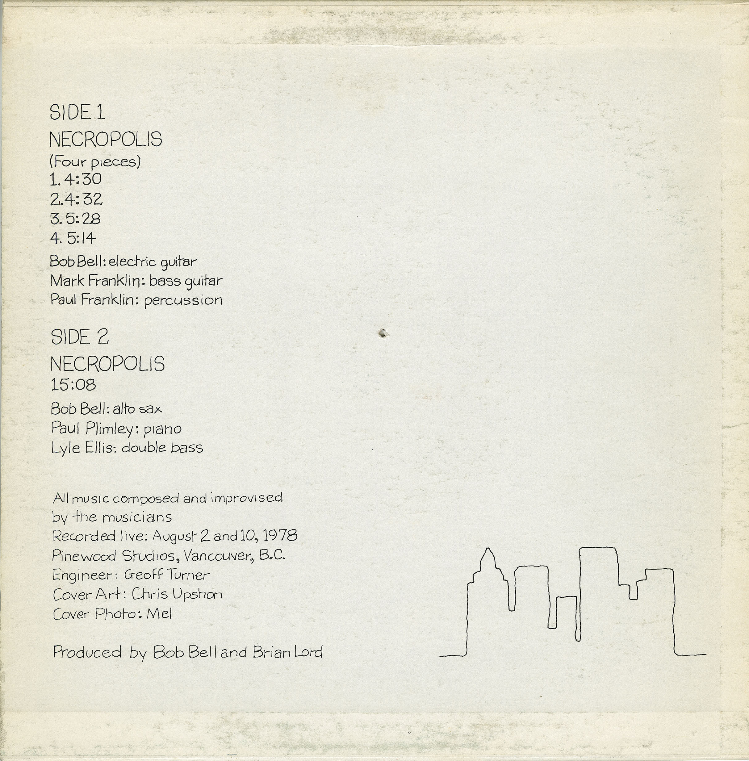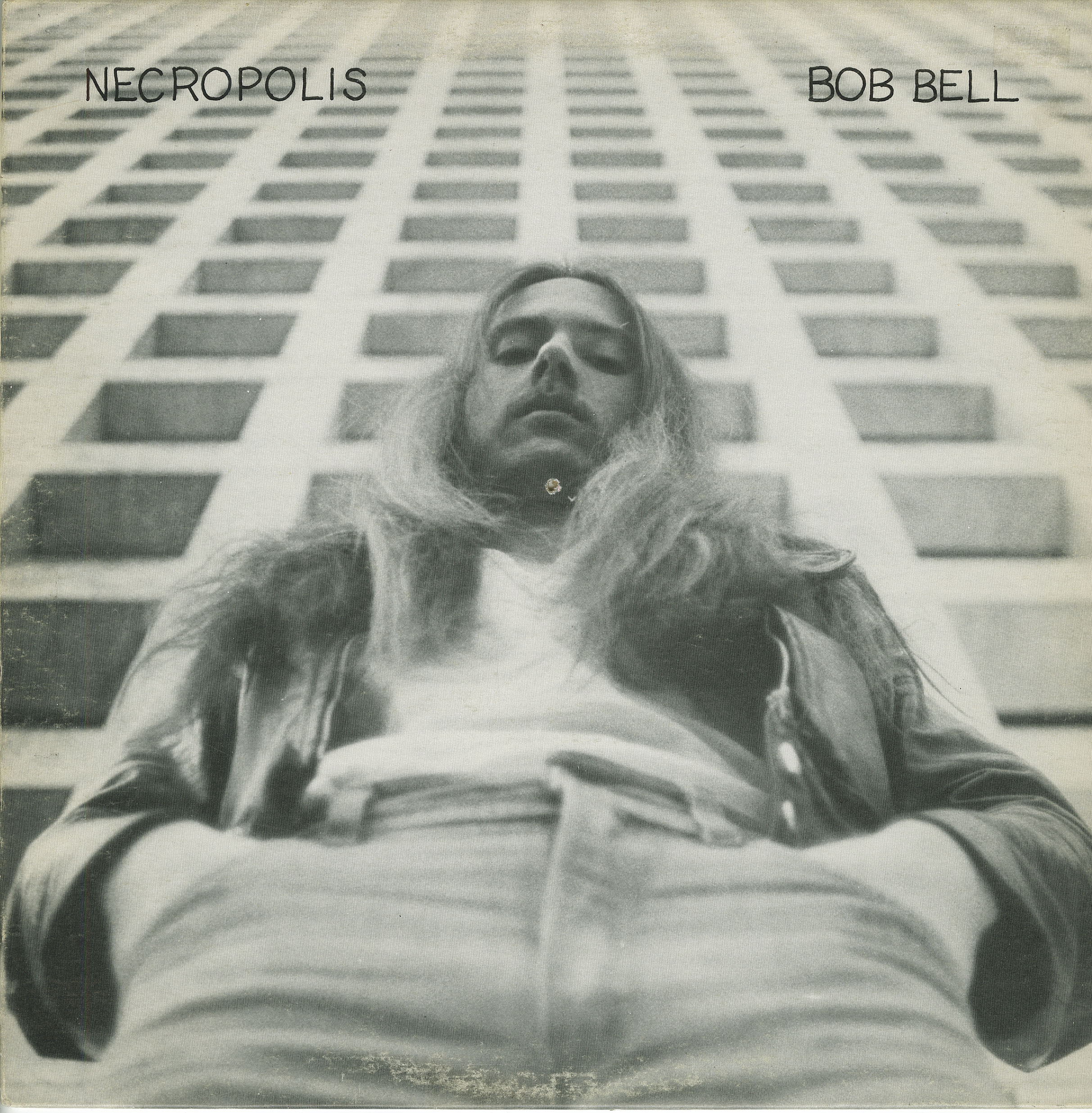 Since its release in 1978, Bob Bell’s Necropolis has grown in stature to become one of Canada’s most highly sought after private-press LPs. The glassy-eyed Vancouver longhair gazing out from the album’s cover photo—strikingly shot from an ant’s eye view pointing up at his denim crotch—doesn’t welcome listeners into his musical world as much as dare them to join him. Recorded over forty-eight hours during which Bell presided over two separate trios, it has him playing guitar on the A-side in four superhuman bursts of psychedelic basement rock by one trio, and switching to alto sax on the flip side for a fifteen-minute free-jazz blastoff by the other trio.