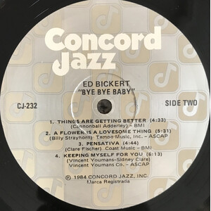 The release of “Bye Bye Baby,” which was taped at Toronto’s Bourbon Street in August 1981, is Bickert’s first U.S. Concord LP. Steve Wallace and Hanna lay out as Bickert and McKenna team up in a dynamic duo on Robin’s title tune, Bye Bye Baby. Dave uses the joyously pulsating pace and then backs Ed’s spirited improvisation. This sense of swing coalesces into one great interplay that marks this as one of the high points of the set.