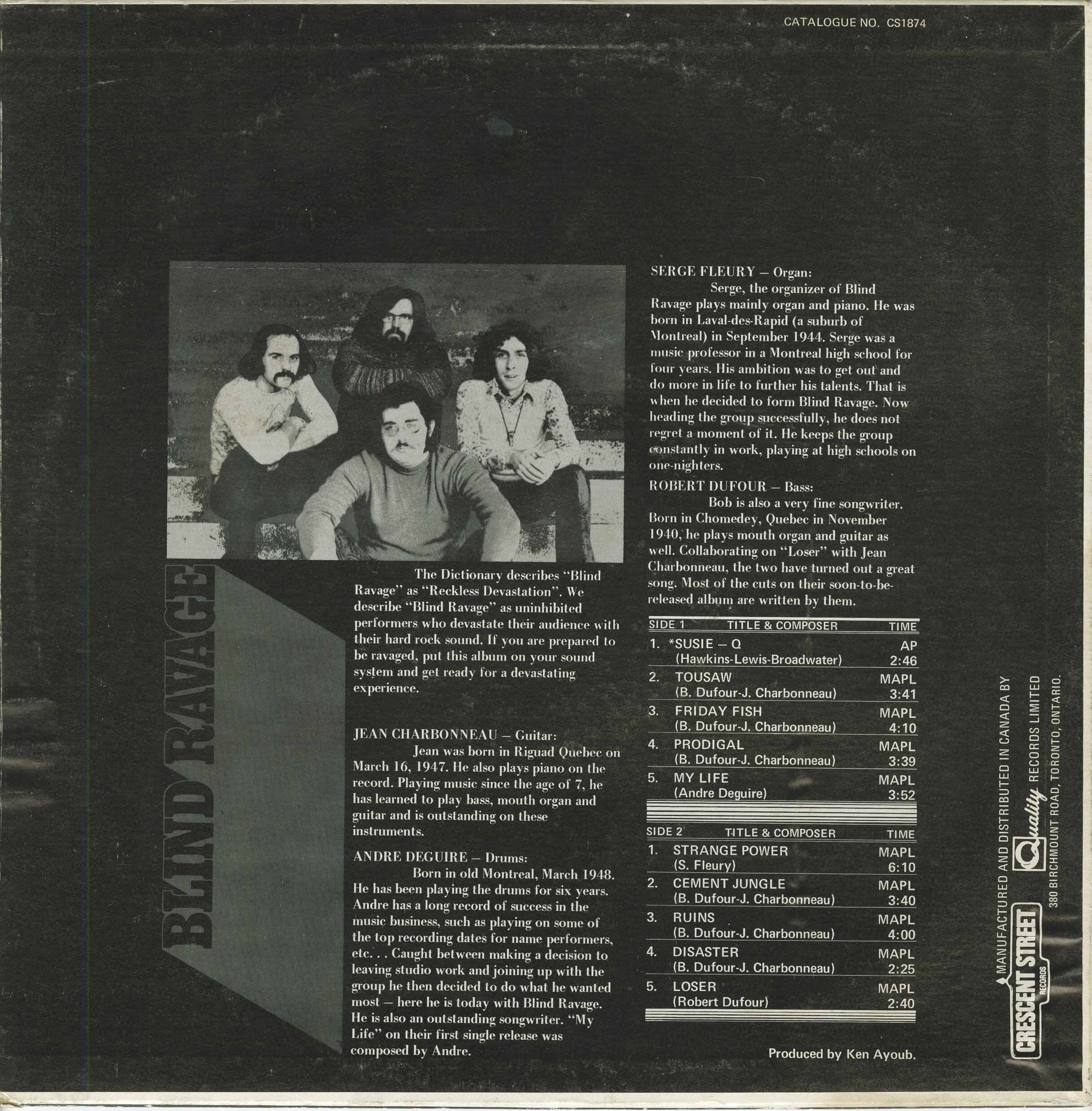 In 1971, the band recorded and released their only album, Blind Ravage, on the Crescent Street label. Produced by Ken Ayoub, the LP featured mostly original material, showcasing the band’s heavy riffs, driving rhythms, and gritty organ work. The Beatles' "Birthday" was the only cover on the album. The single “Loser” backed with “My Life” was also released, but despite the group’s efforts and strong live presence, the album didn’t achieve mainstream commercial success at the time.