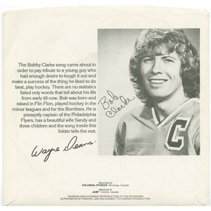 The song and accompanying sleeve notes focus on Clarke’s early development in Flin Flon, his minor league years, and his emergence as a star with the Philadelphia Flyers, where he became team captain and one of the defining players of the franchise’s most successful era. The record presents Clarke not just as a celebrity athlete, but as a family man and hometown figure whose success remained closely tied to his northern roots.