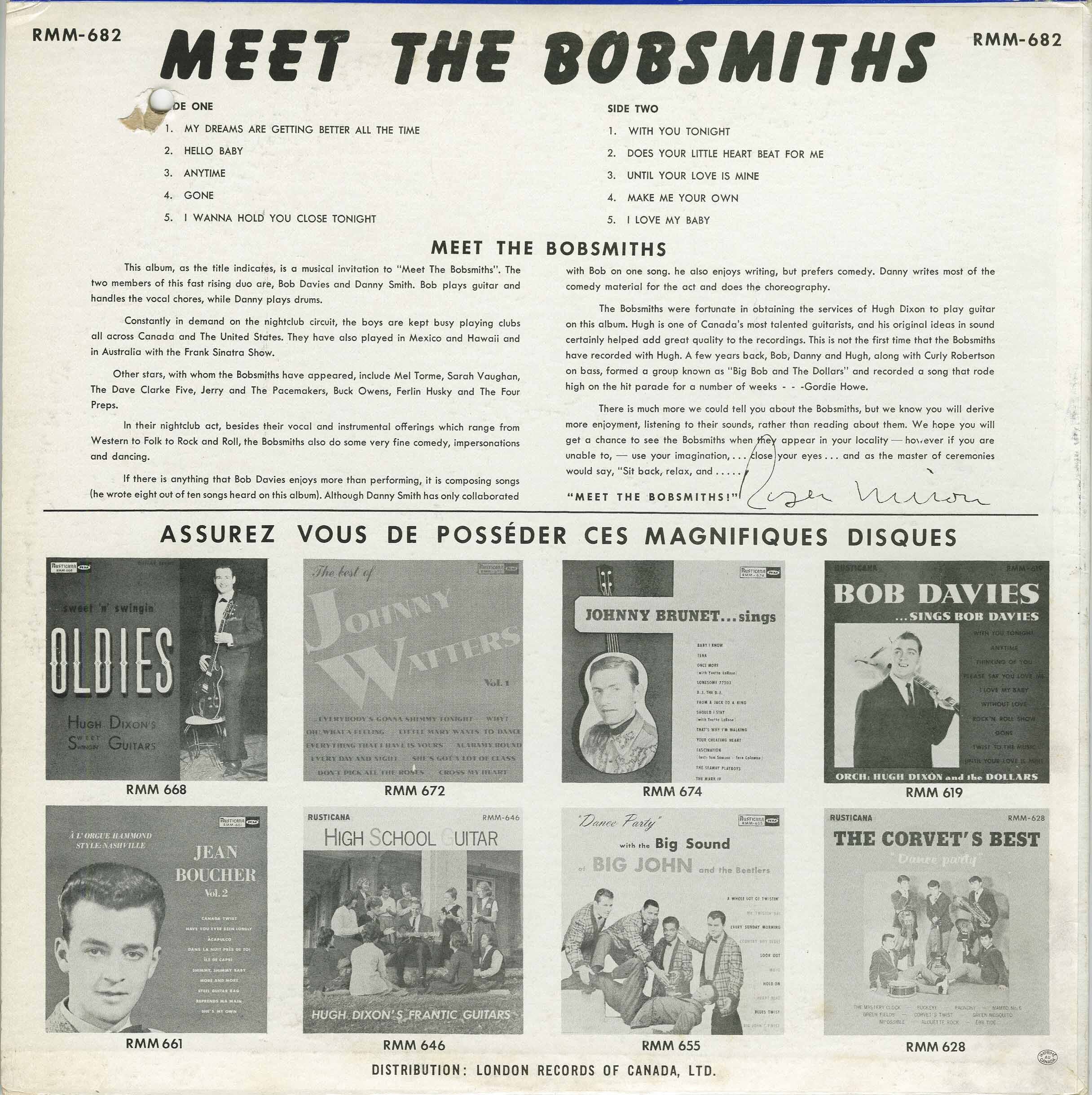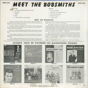 The Bobsmiths were fortunate in obtaining the services of Hugh Dixon to play guitar on this album. Hugh is one of Canada’s most talented guitarists, and his skills and musicianship certainly lend depth and great quality to the recording. This is not the first time that the Bobsmiths have been associated with Hugh. Years back, both Danny and Hugh, along with a lad named Bob Jones, formed a group known as “Big Bob and The Dollars” and recorded a song that rode high on the hit parade for a number of weeks . . . “Gloria” theme.