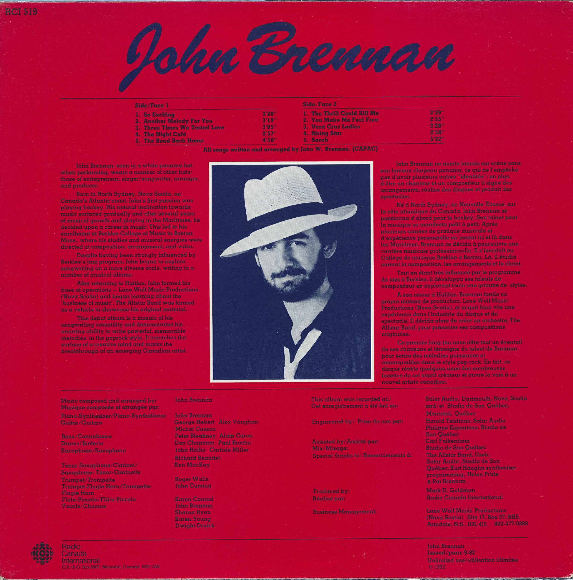 By the early 1980s, Brennan had assembled what became known locally as the All-Star Band, a seven-piece ensemble featuring Nova Scotia’s most dependable rhythm section and Halifax’s top horn players. The group’s chemistry culminated in Brennan’s self-titled debut LP, released in 1982 on Radio Canada International (RCI 519). Recorded at Solar Audio in Dartmouth and Studio de Son in Montréal, the album was co-engineered by Harold Tsistinas and Carl Falkenham, and produced by Mark D. Goldman.