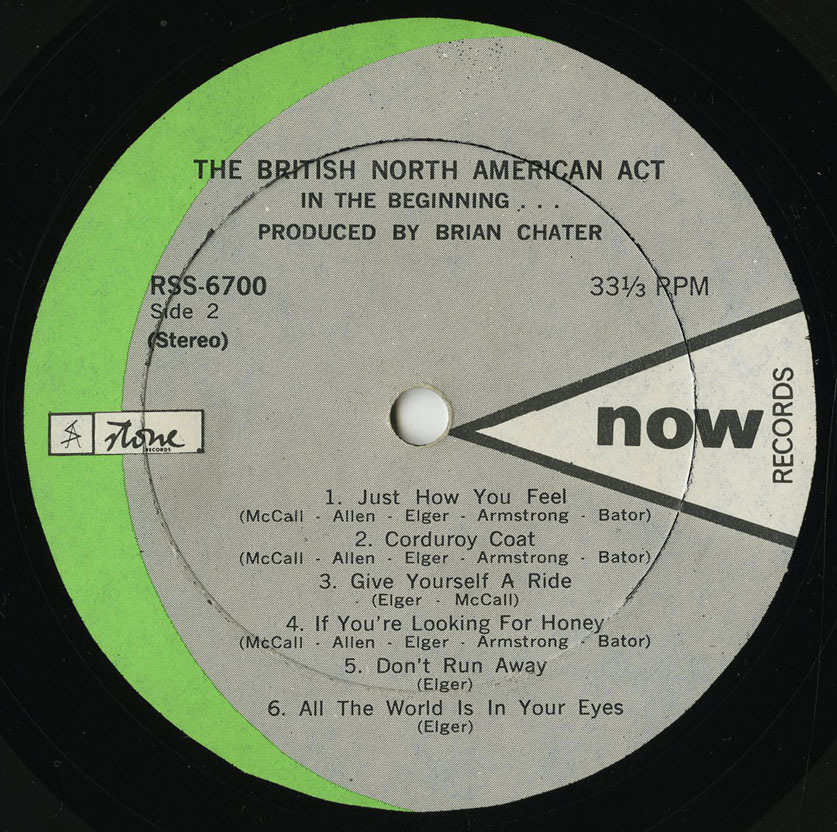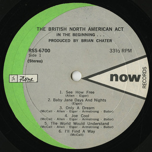 The British North-American Act formed in Montréal, Québec in 1968 and shortly thereafter they recorded an album of all original material "In The Beginning...", their only album, on Now Records in 1969. It was accompanied by the single "The World Will Understand b/w Joe Cool" on Now Records RS 600. The British North-American Act were Andy Bator, born in Hungary on February 20th, 1947 on organ and piano; Bob Allen, born in Montreal on July 3rd, 1946 on lead guitar; Dave McCall, born in Suffolk, England on November 11th, 1948 on drums; Rick Elger, born in Liverpool, England on rhythm guitar, harmonica and lead singer; and Kirk Armstrong, born in Montreal on June 20th, 1946 on bass.