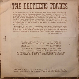 While the Brothers Forbes would go on to a twelve-year run at Victoria’s Old Forge nightclub, with countless lineup changes and a loyal following, The Happening B.C. remains their most tangible recorded legacy from the era. Decades later, it was reissued on CD under the title British Columbia Our Home, accompanied by an extensive booklet containing detailed liner notes that chronicle the brothers’ careers, their family’s deep British Columbia roots, and their long-standing presence in Victoria’s live music scene.
