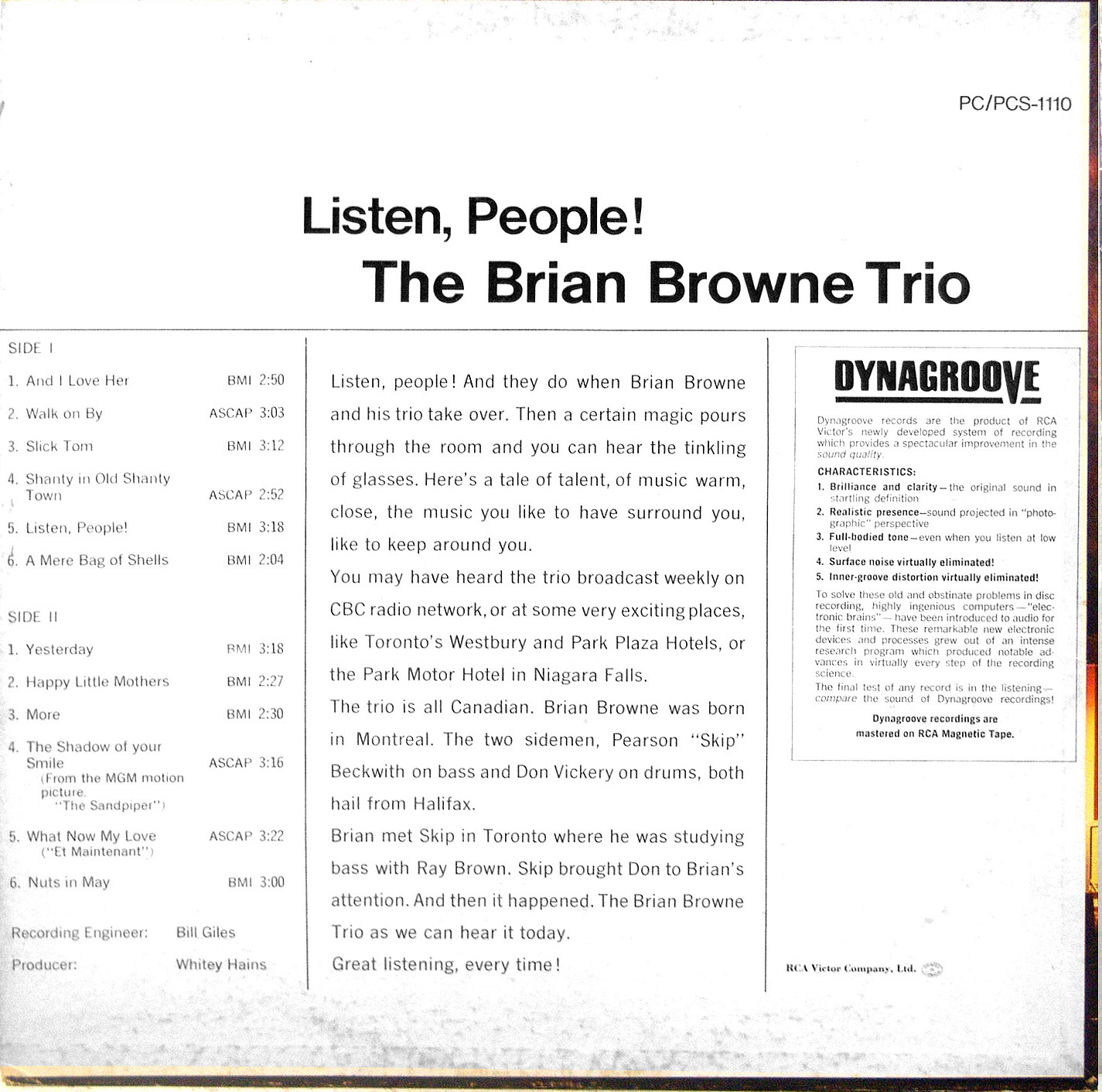 In 1957 he formed the first Brian Browne Trio with bassist Sol Gunner and drummer Glenn Robb, playing Ottawa’s Beacon Arms Hotel and other clubs in the region. Selective about where he performed, Browne positioned himself squarely within serious jazz circles. He hosted a short-lived Ottawa radio show that caught the attention of CBC producer Peter Shaw, who transformed it into The Browne Beat, a weekly national program that helped make Browne a recognizable name.