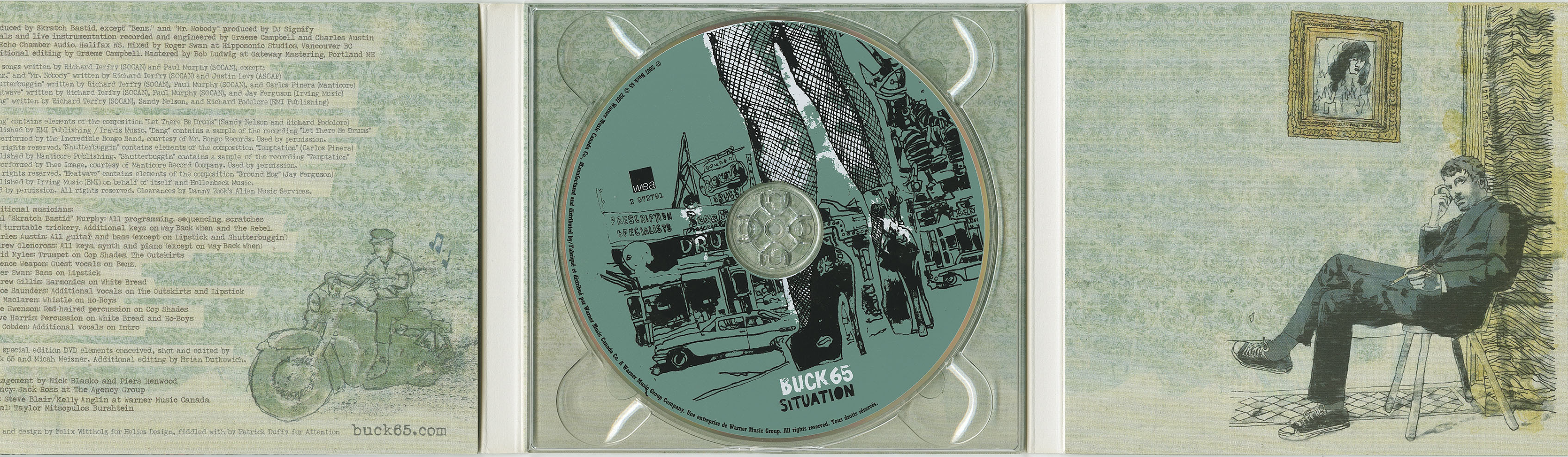 His best role, the dreamlike tale of a Travis Bickle in the making, "Mr. Nobody" reveals Buck 65 at his most poignant and, yes, grown-up. An album full of these character sketches-- with their gray areas and their slow-burning, cinematic arrangements-- would have made an astute and intimate work of social commentary. Instead the argument buckles not only under the weight of references, but also the tired flow and beats. Favoring the easy gravity of images and ideas over well-crafted sounds and stories, Situation finally drowns in its nostalgia.