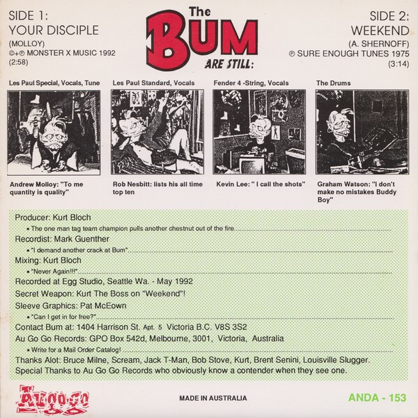 Bum’s debut full-length album, Wanna Smash Sensation! (Munster Records, 1993), brought together singles, new material, and extended experiments such as the side-long track ‘No Idea’. Recorded primarily at Egg Studio in Seattle and produced by Bloch, the album showcased the group’s range—from concise power-pop blasts to looser, jam-oriented structures—and has since become a cult favourite among collectors of Canadian punk and pop-punk records. The album’s combination of immediacy, charm, and unpolished energy has helped it endure well beyond the band’s original lifespan.