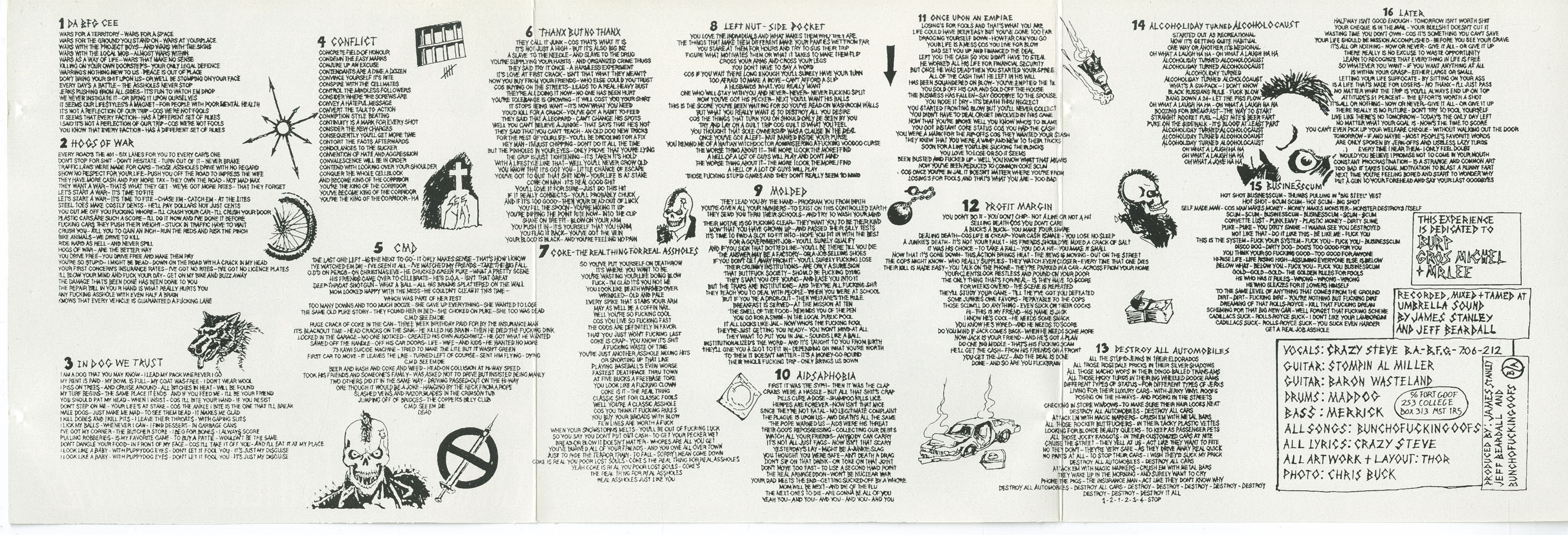 The band became notorious for its confrontational live performances, heavy alcohol consumption, and frequent conflicts both on and off stage. This reputation extended to their audience and contributed to their status as one of the most polarizing acts in Canadian hardcore. During the late 1980s, Bunchofuckingoofs released material on God Records and Fringe Product, placing them alongside labelmates such as the Dayglo Abortions within Canada’s most extreme punk output of the era.